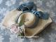 アンティーク ドール用 ストローハット グレイッシュブルーのリボン & 淡いピンクの薔薇の布花