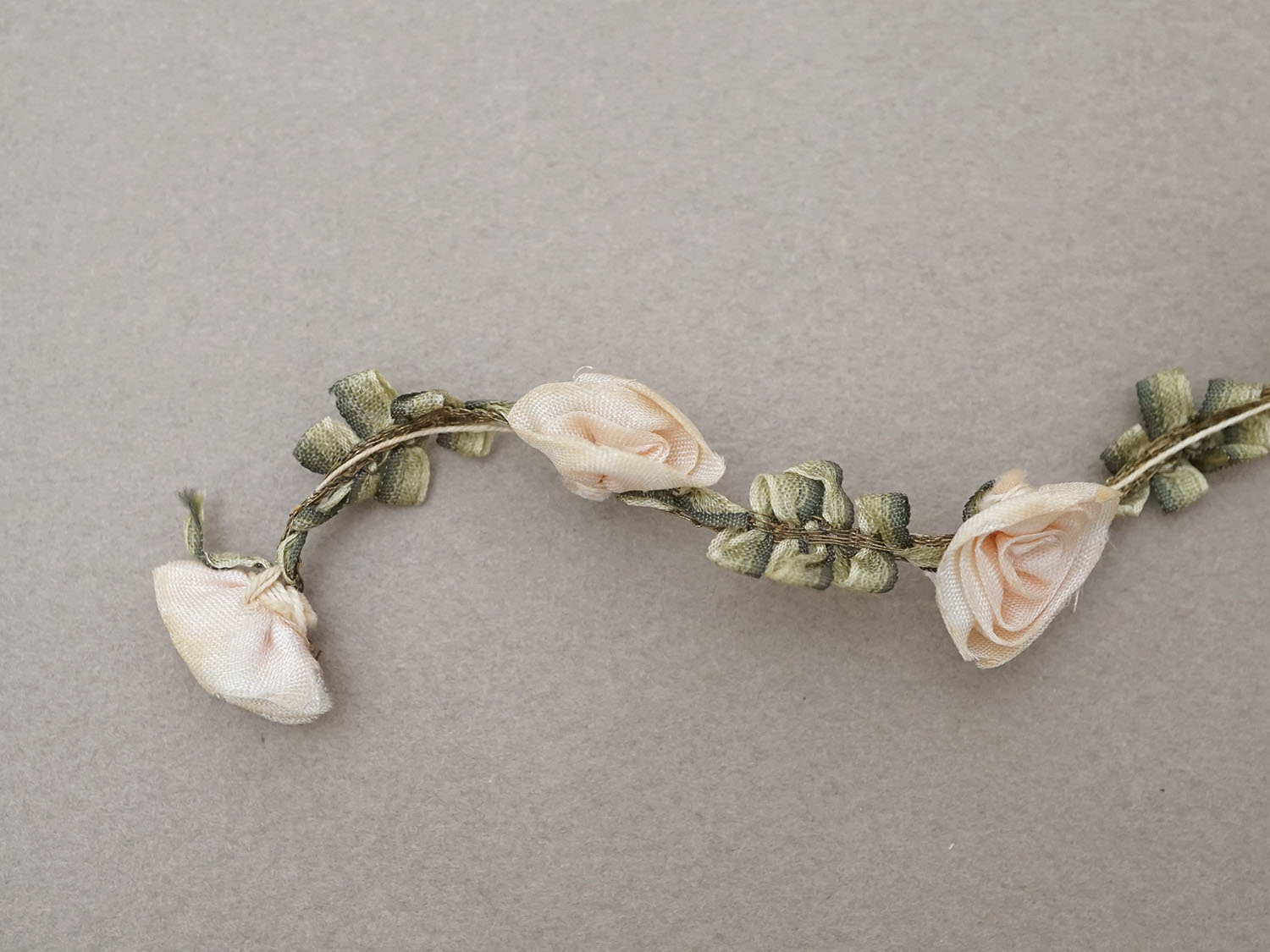 アンティーク シルク製 パウダーピンクの薔薇のロココトリム 59cm [戻る]