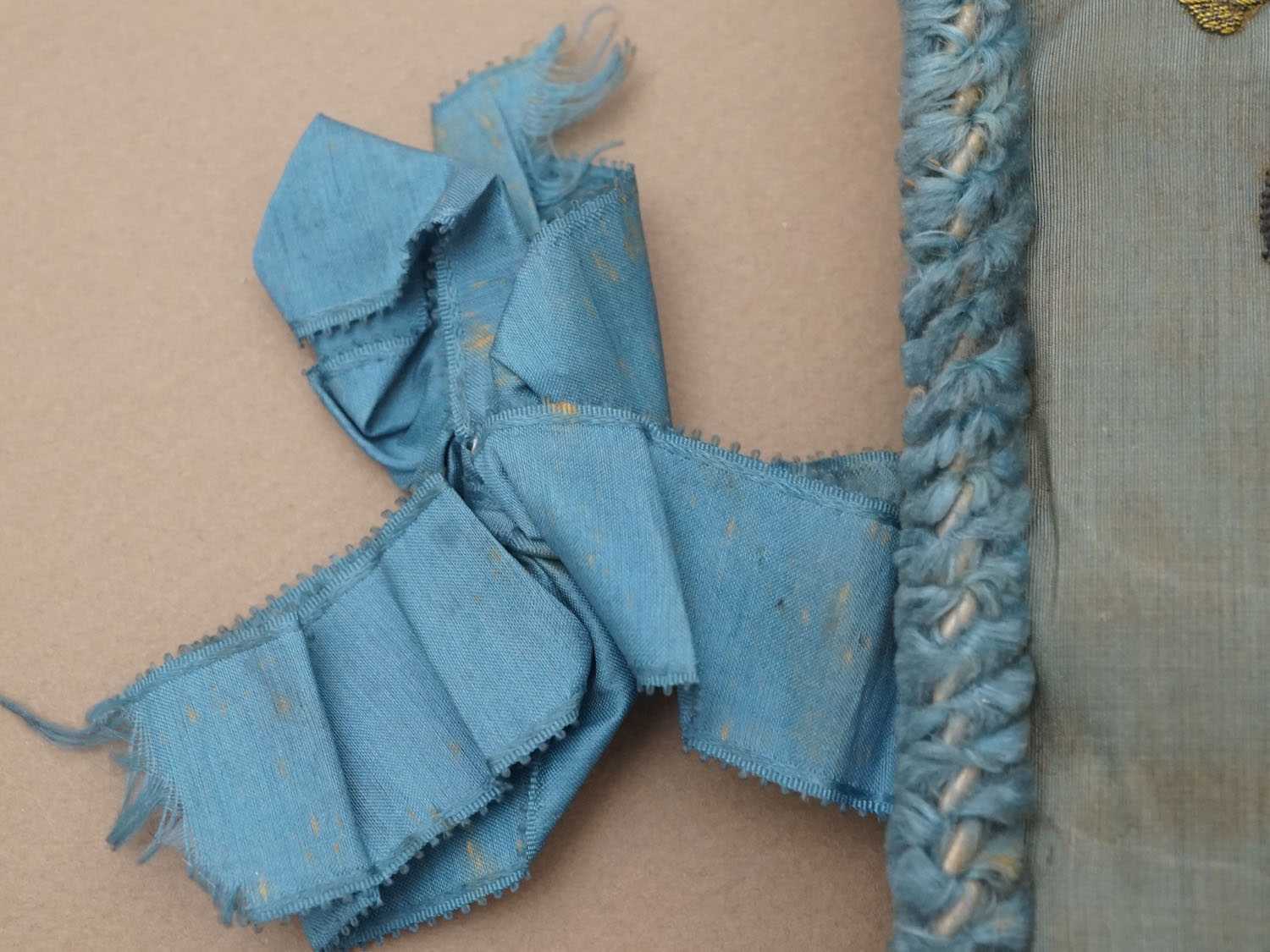 *蚤の市*アンティーク シルク製 ハンキーケース モノグラム&花刺繍 ハンカチ用ポシェット グレイッシュブルー [戻る]