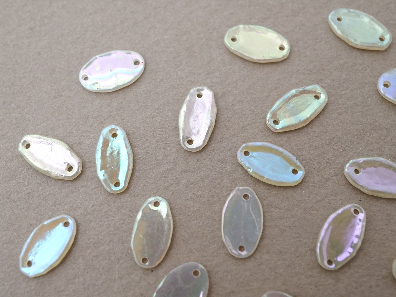 アンティーク ゼラチン製 スパンコール オーロラカラー 10〜11×5〜7mm 約24ピースのセット [戻る]