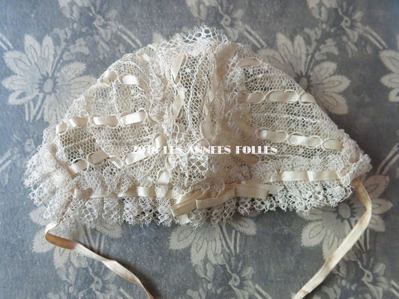 アンティーク ドール用 シルクリボン&手編みのレースのボネ [戻る]