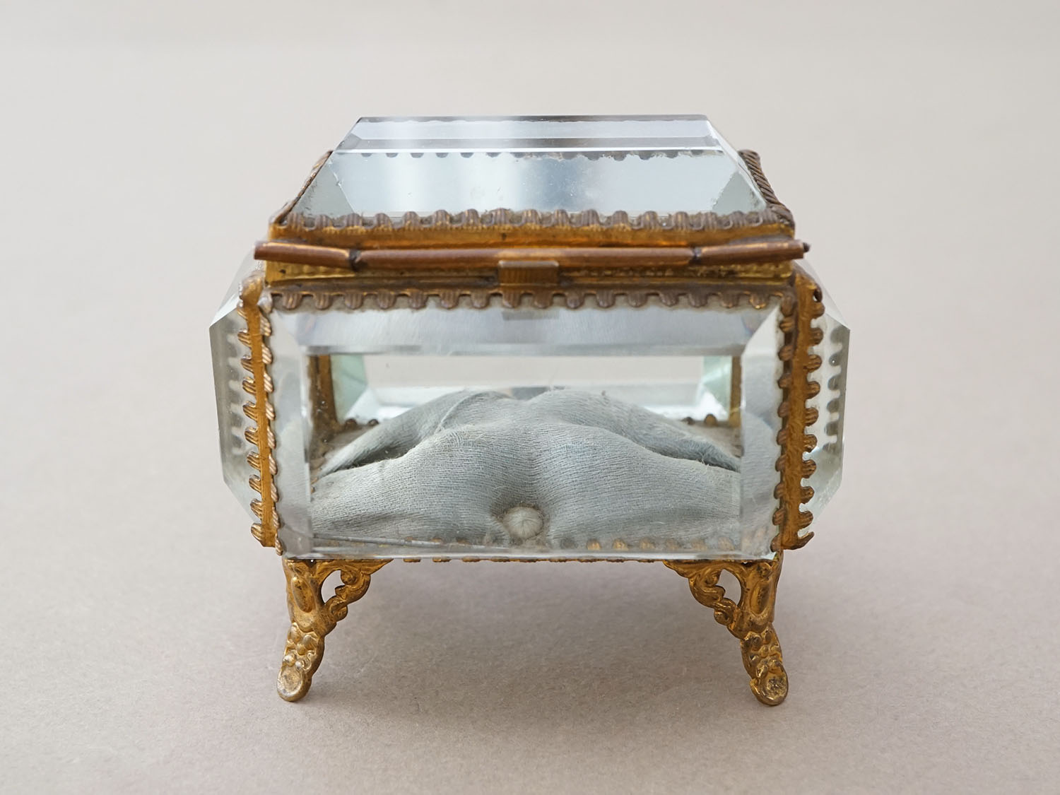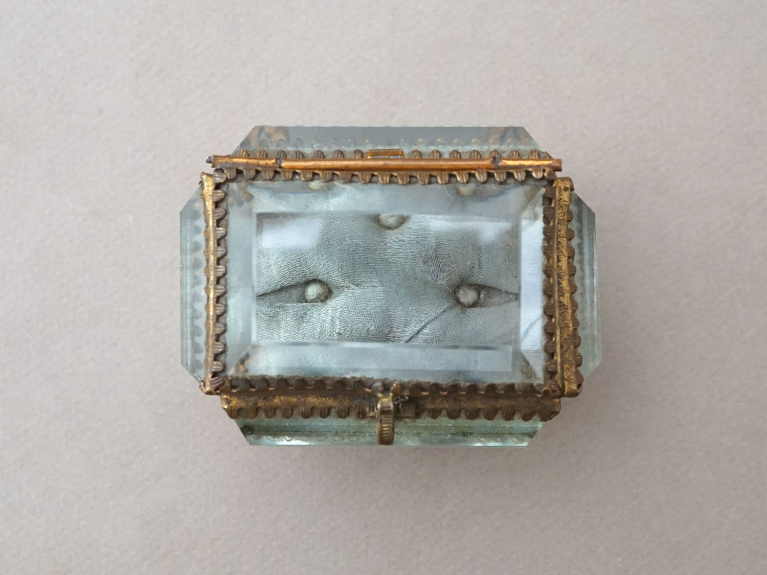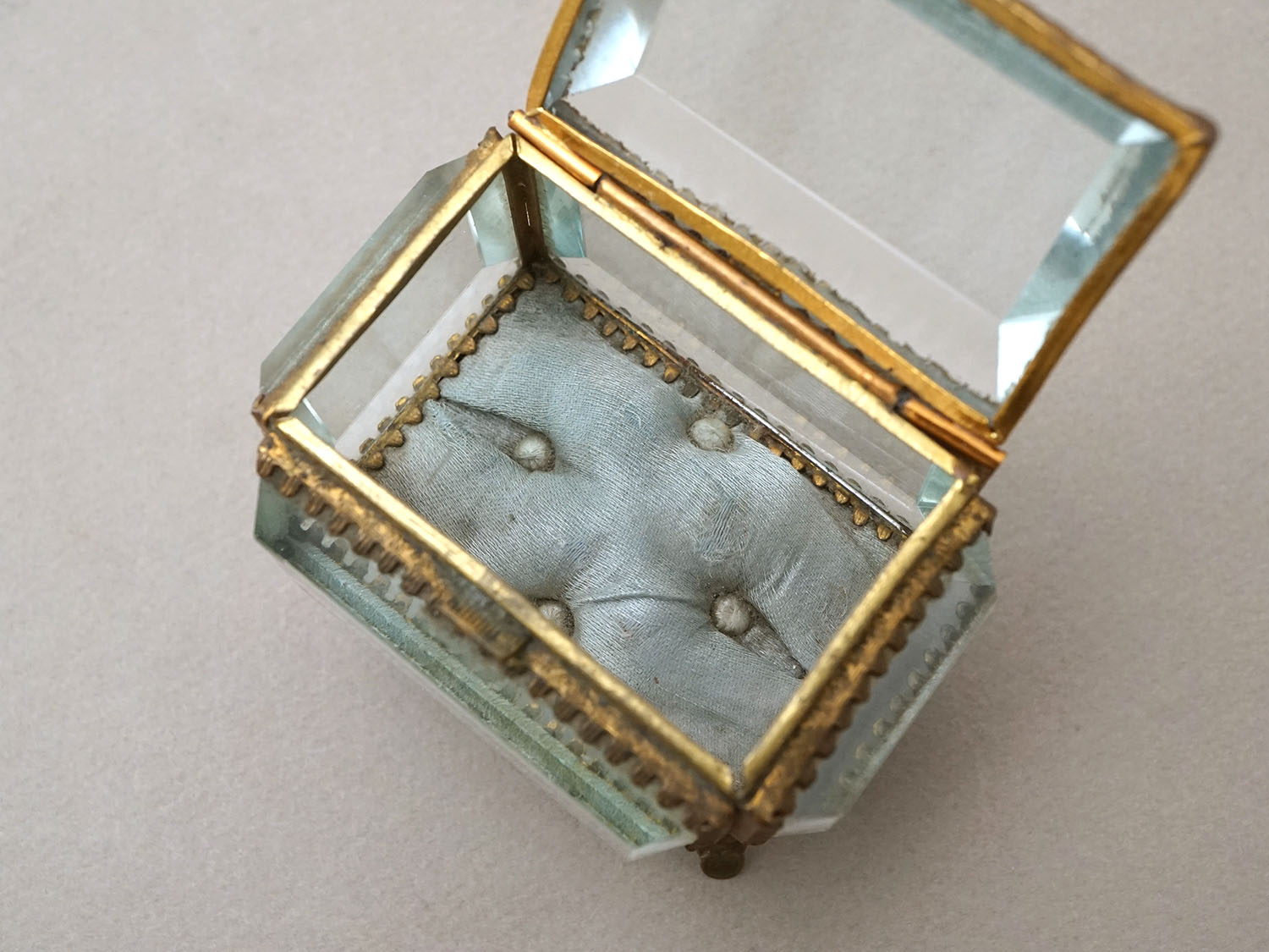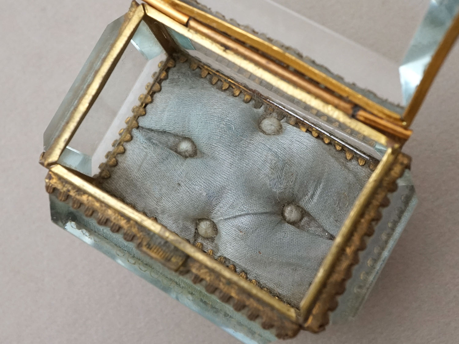 淡いグレイッシュブルーのシルク製クッションが敷かれたジュエリーボックスです。