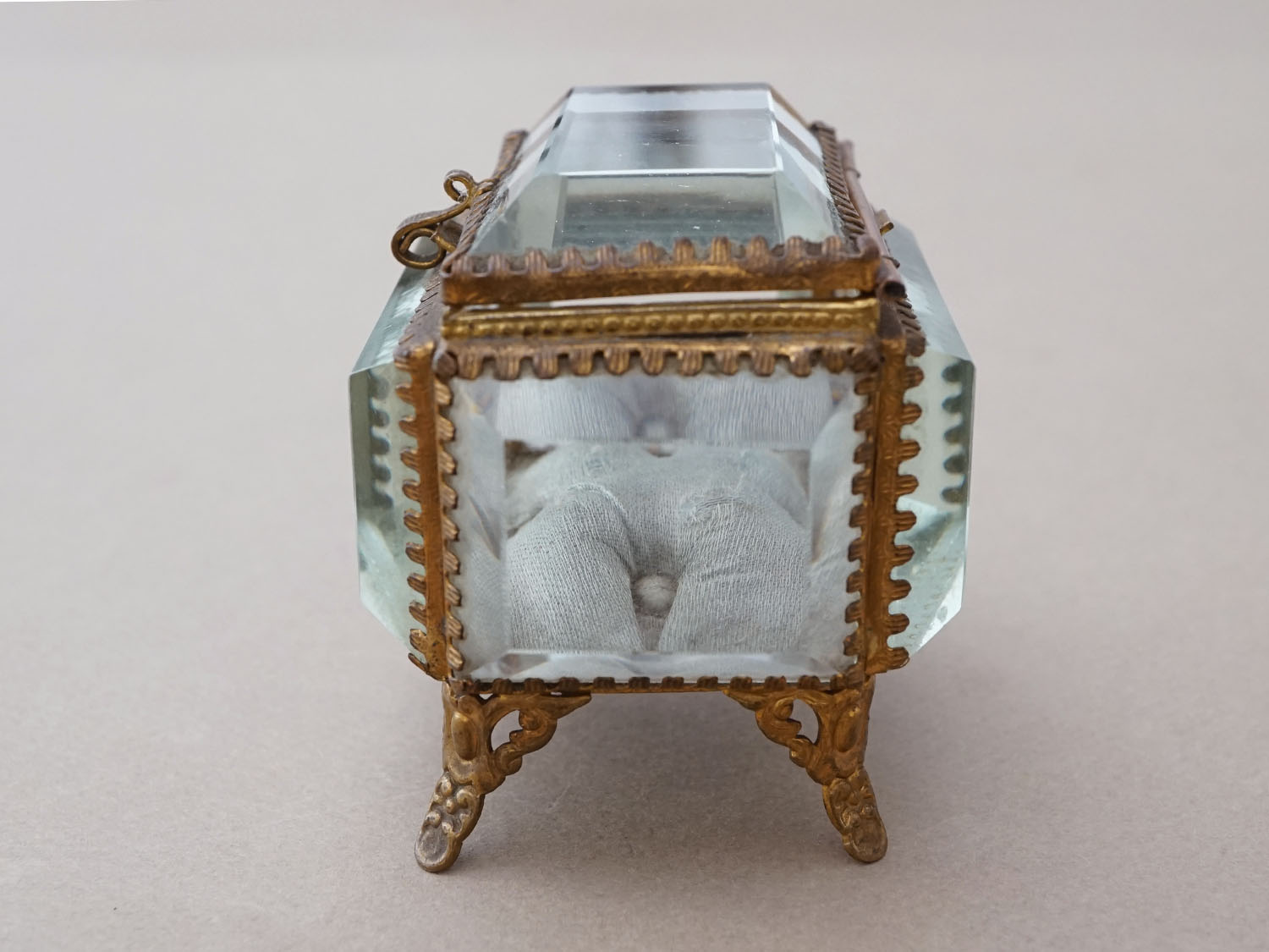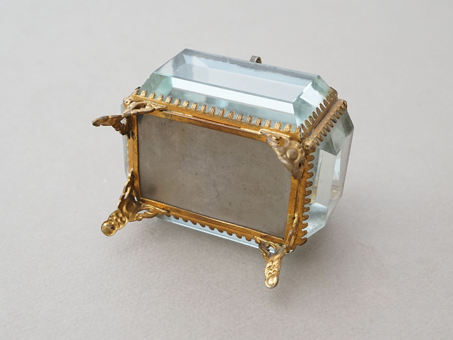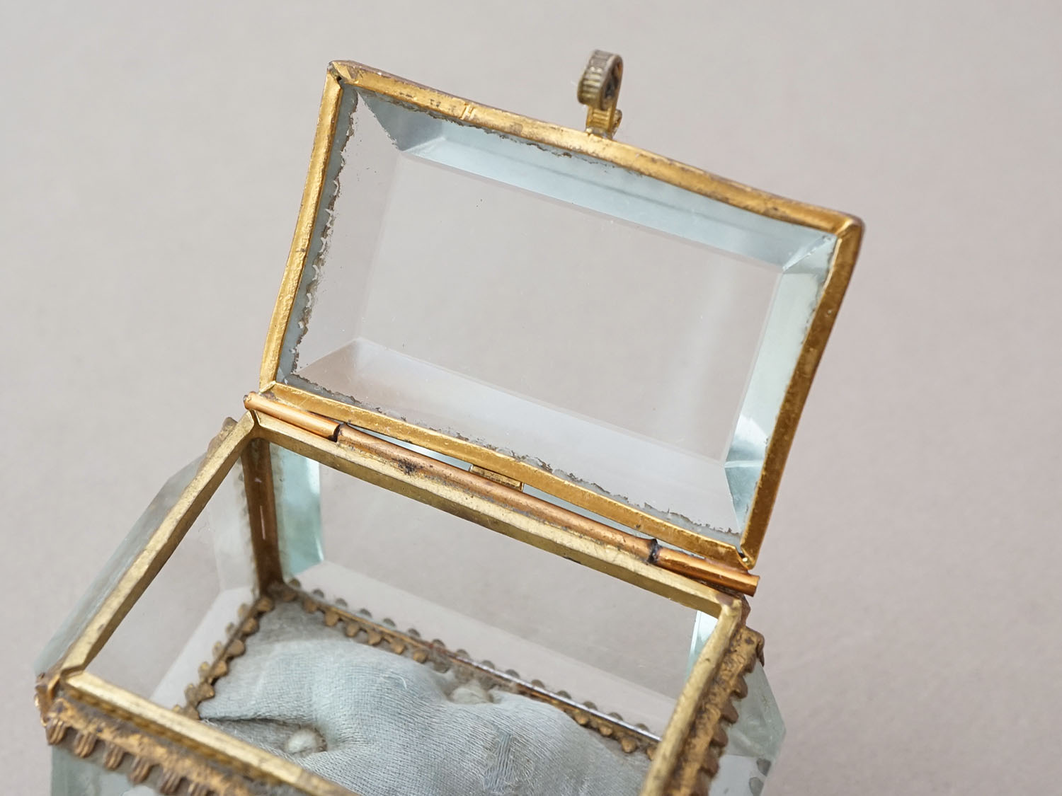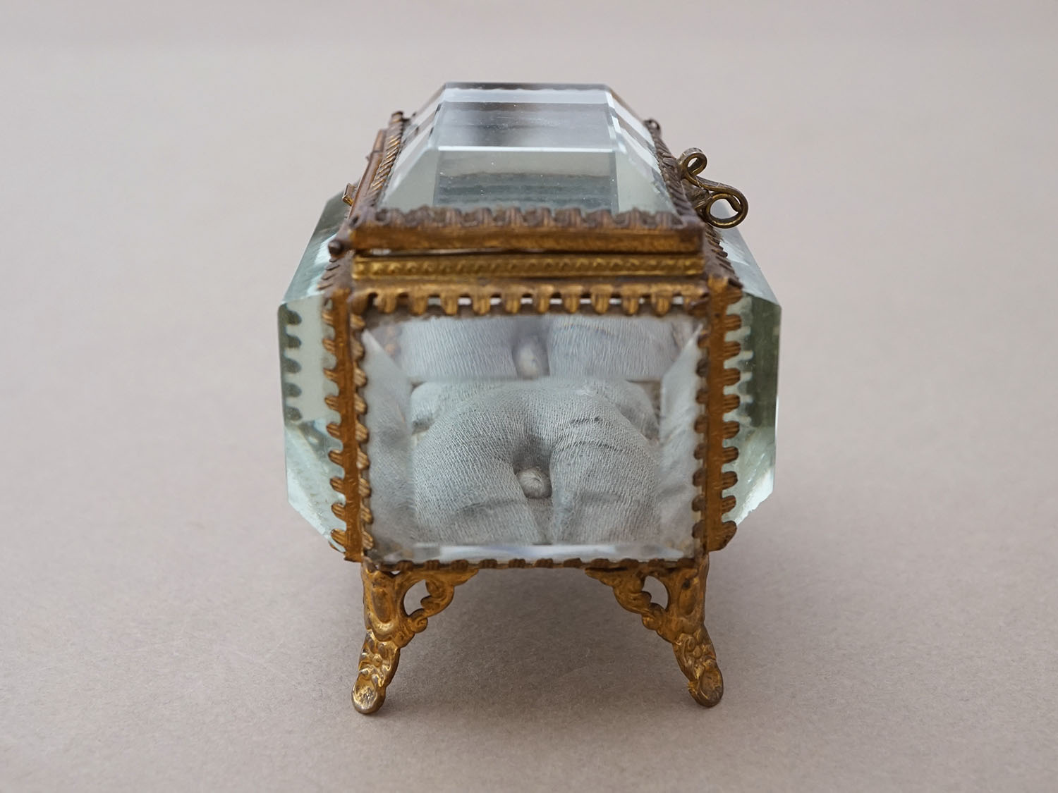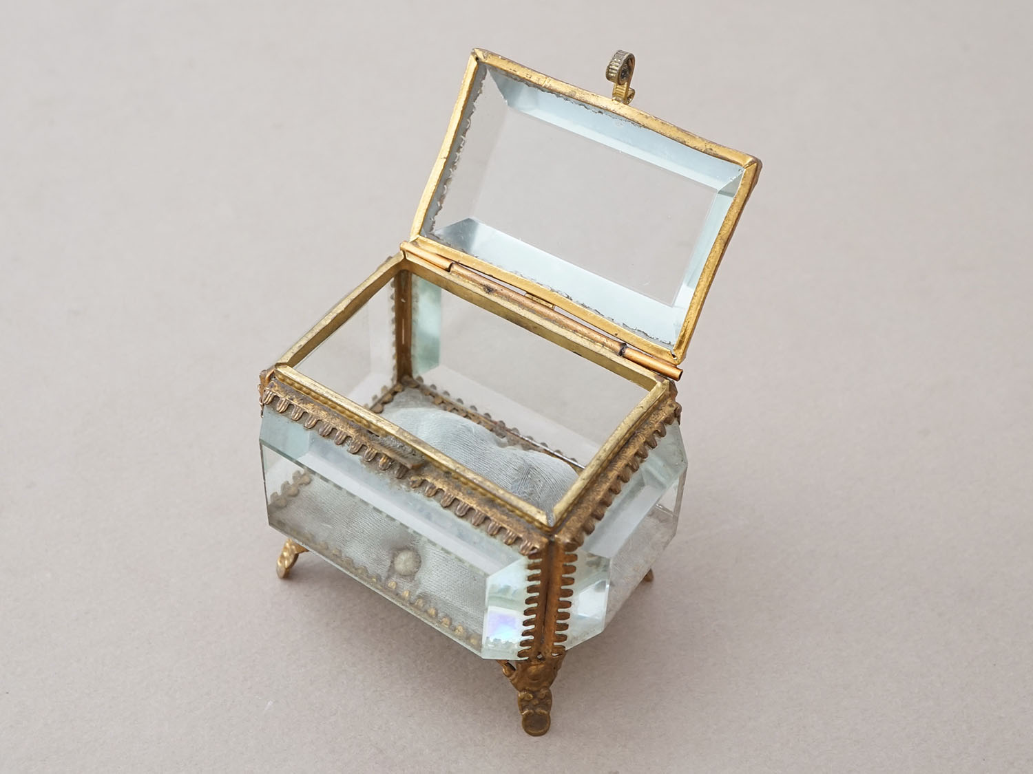 淡いグレイッシュブルーのシルク製クッションが敷かれたジュエリーボックスです。