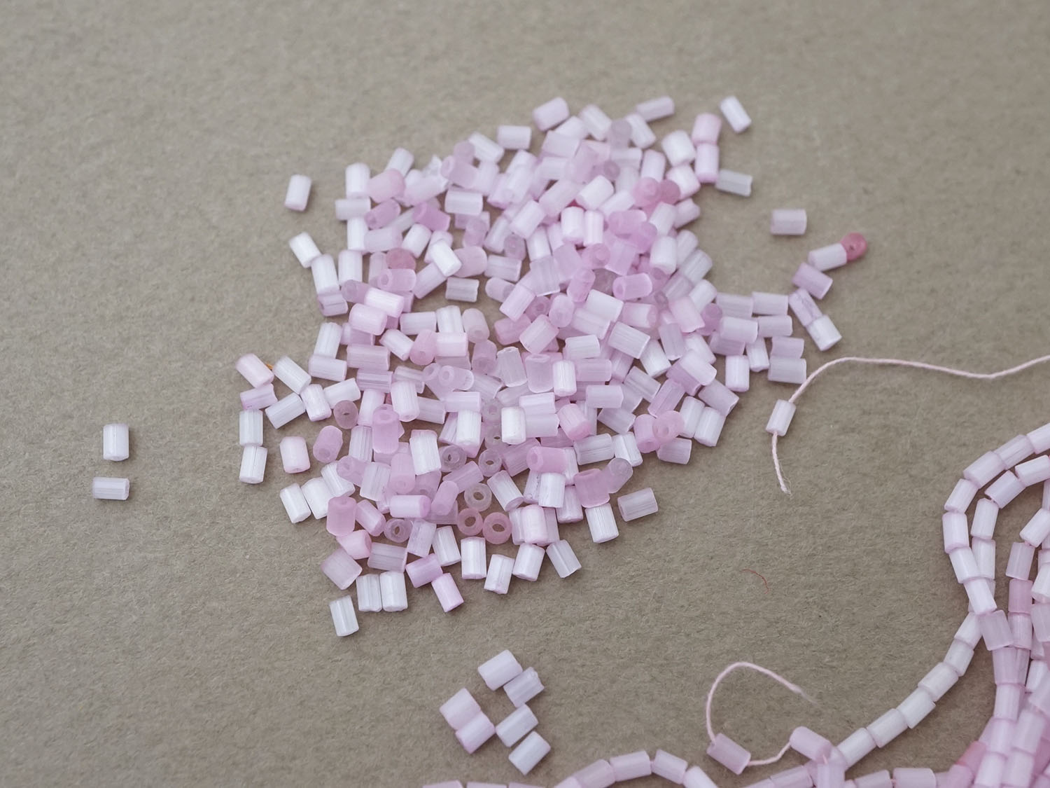 ガラス製でライラックピンク色のサティネビーズ41gです。