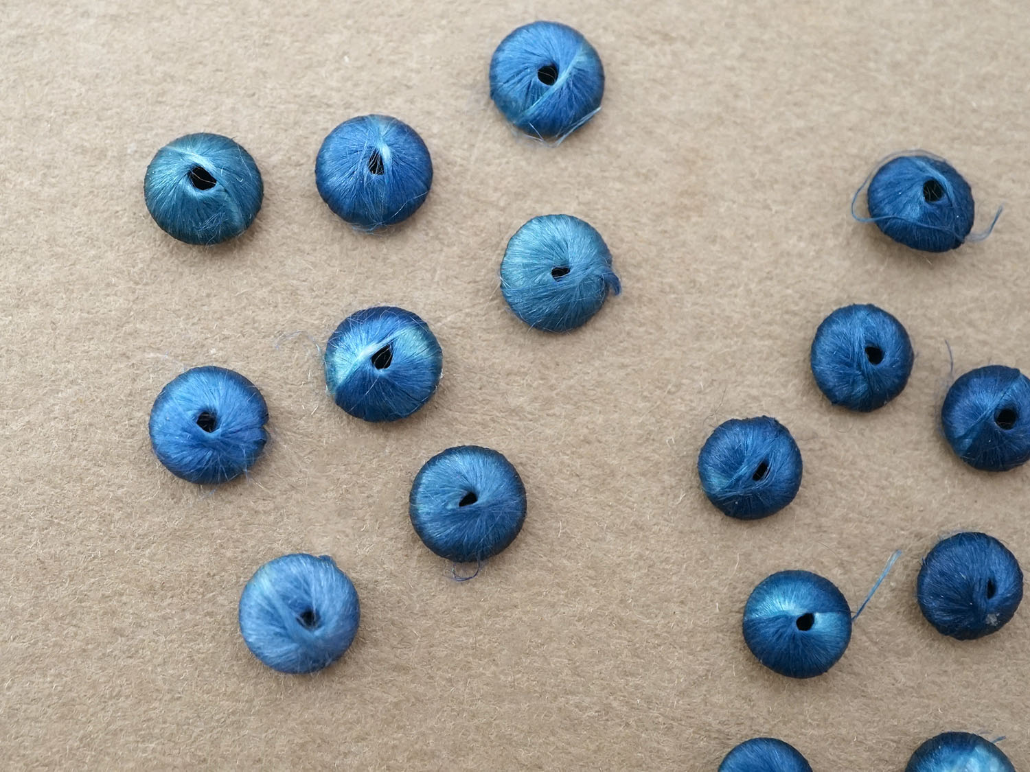 ブルーのシルク製くるみボタン、19ピースのセットです。