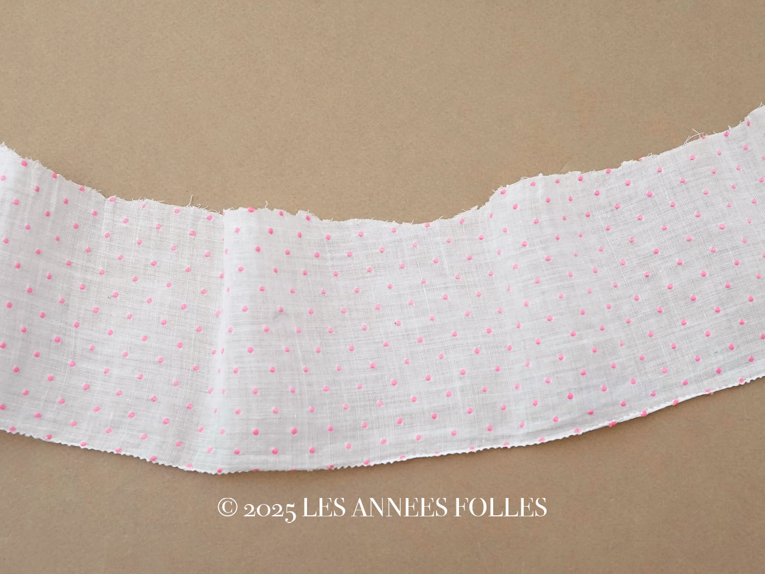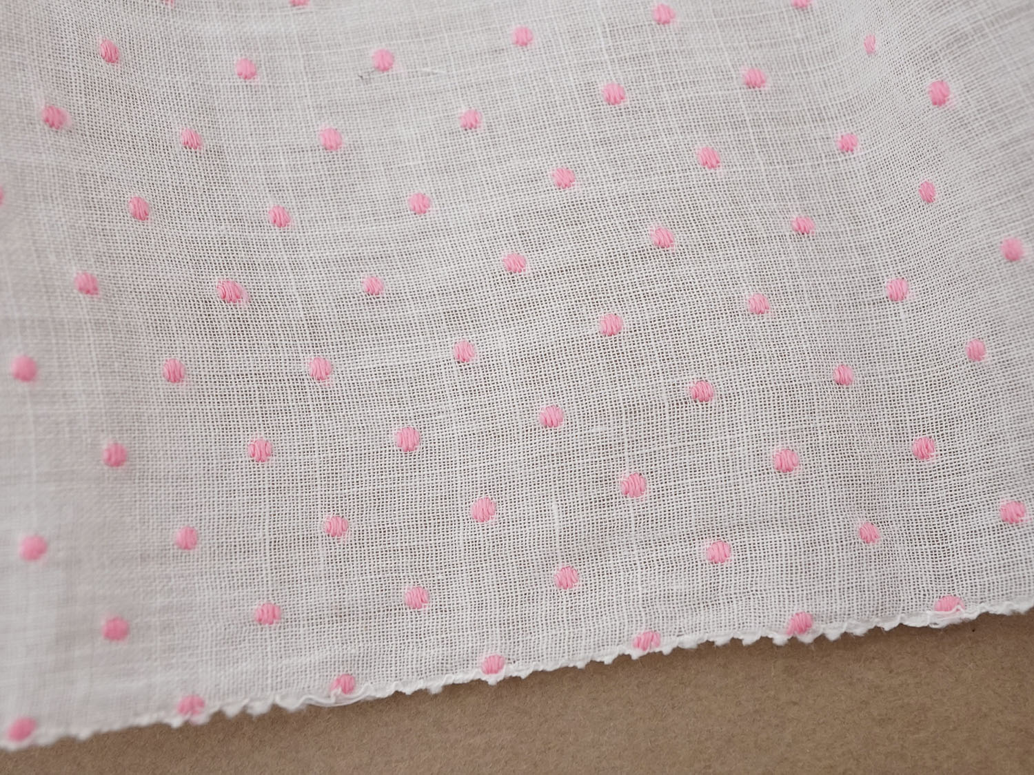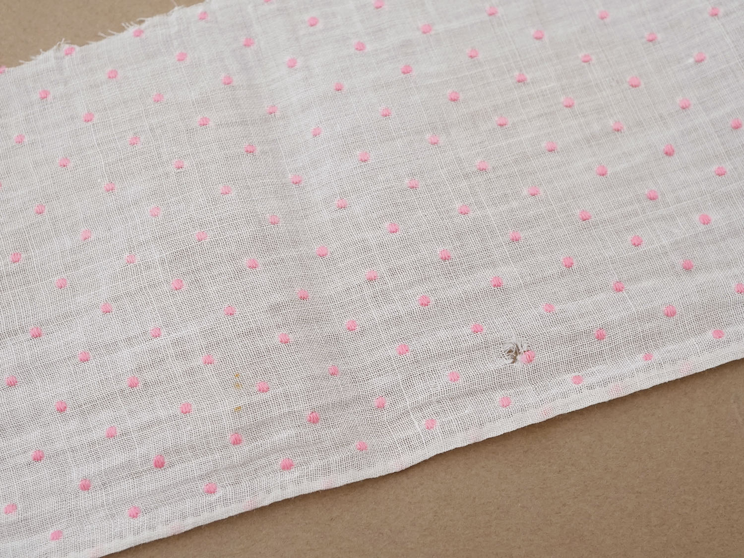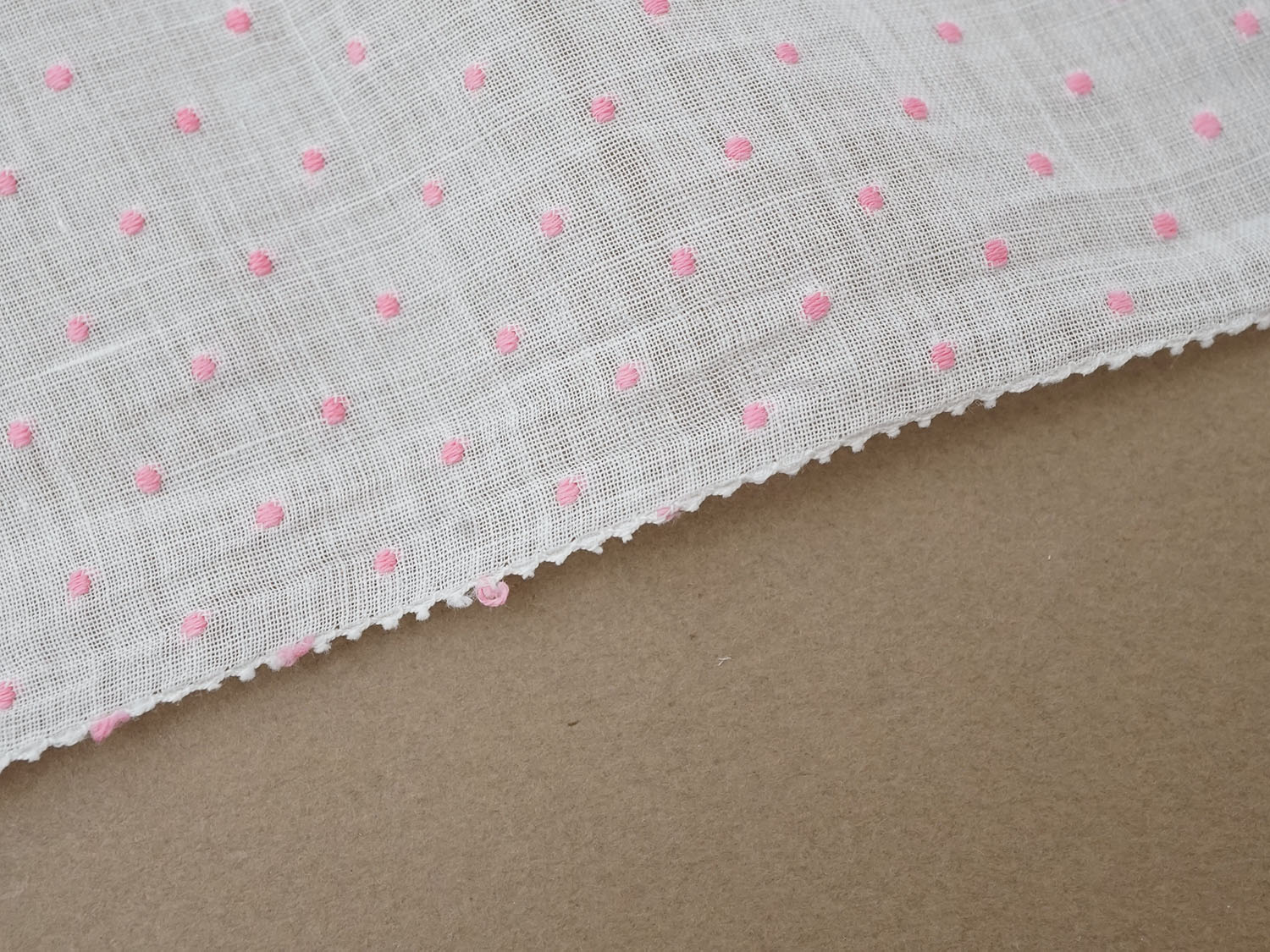 ピンクの小さなドットのふっくらした刺繍入り薄手のコットンオーガンジー6.57mです。