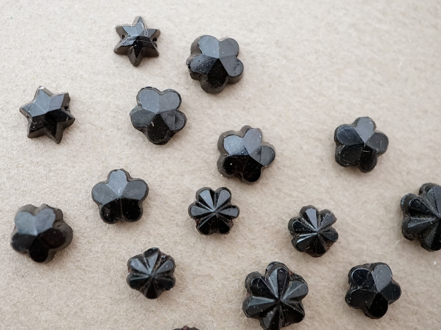 とても希少な花型と星型のとても小さなフレンチジェットのビーズ16ピースのセットです。