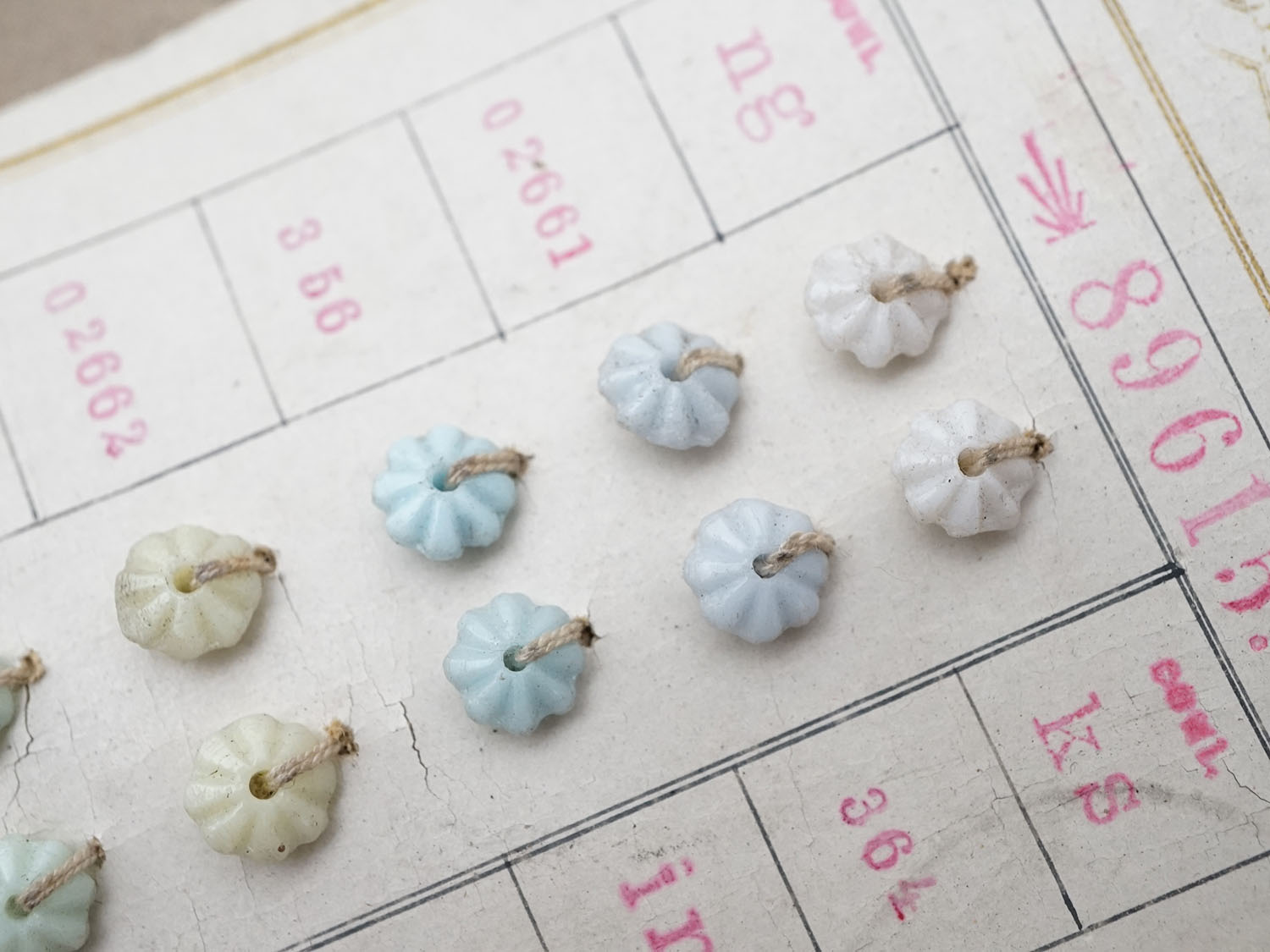 小さな6mmサイズで、立体的なころんとした花形のガラスビーズが並んでいます。