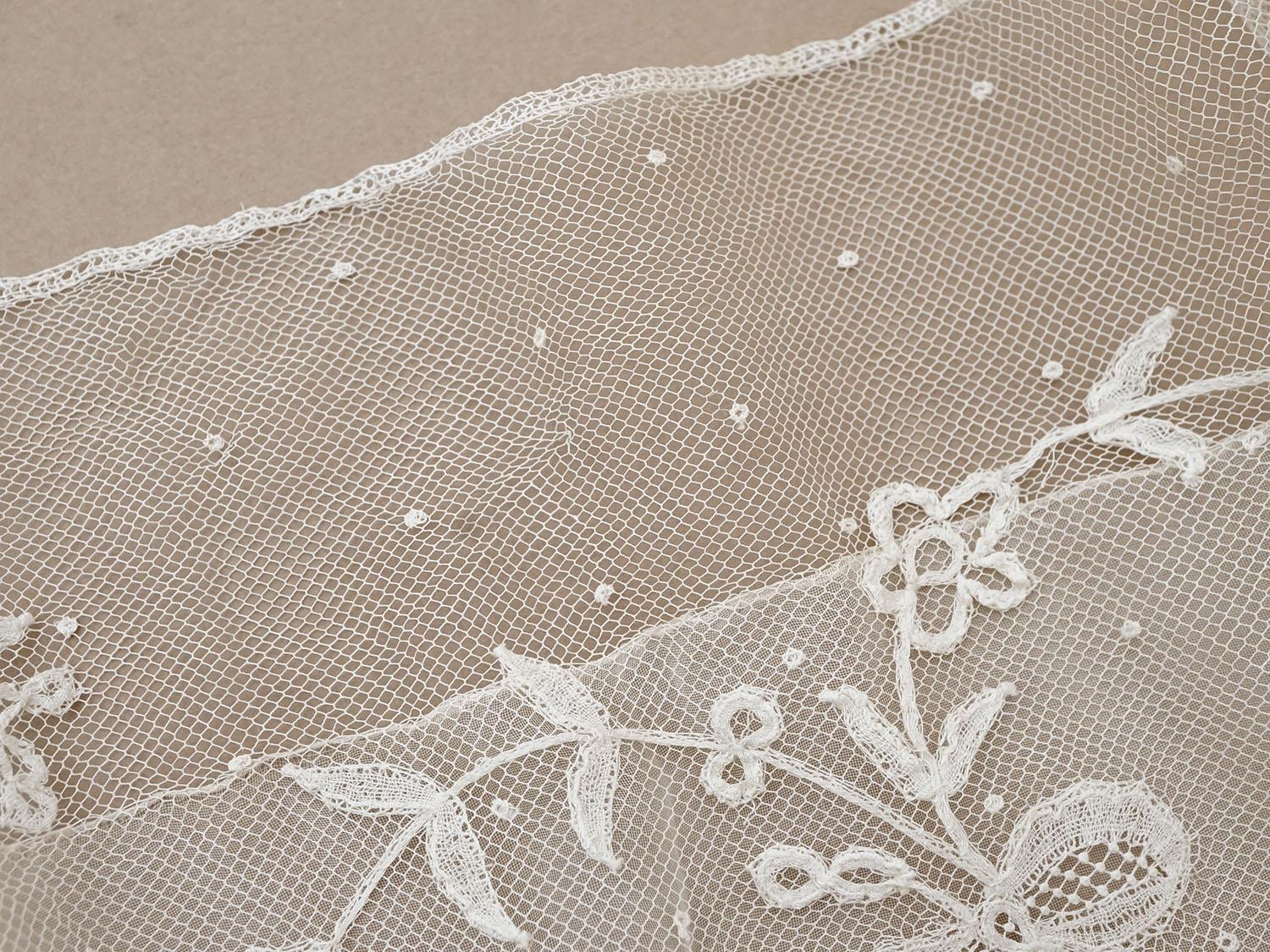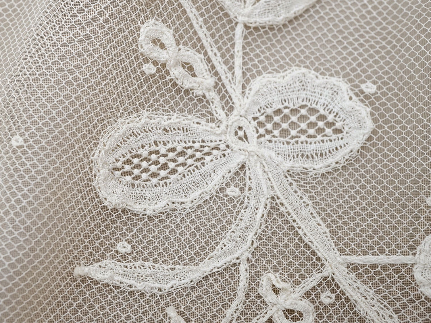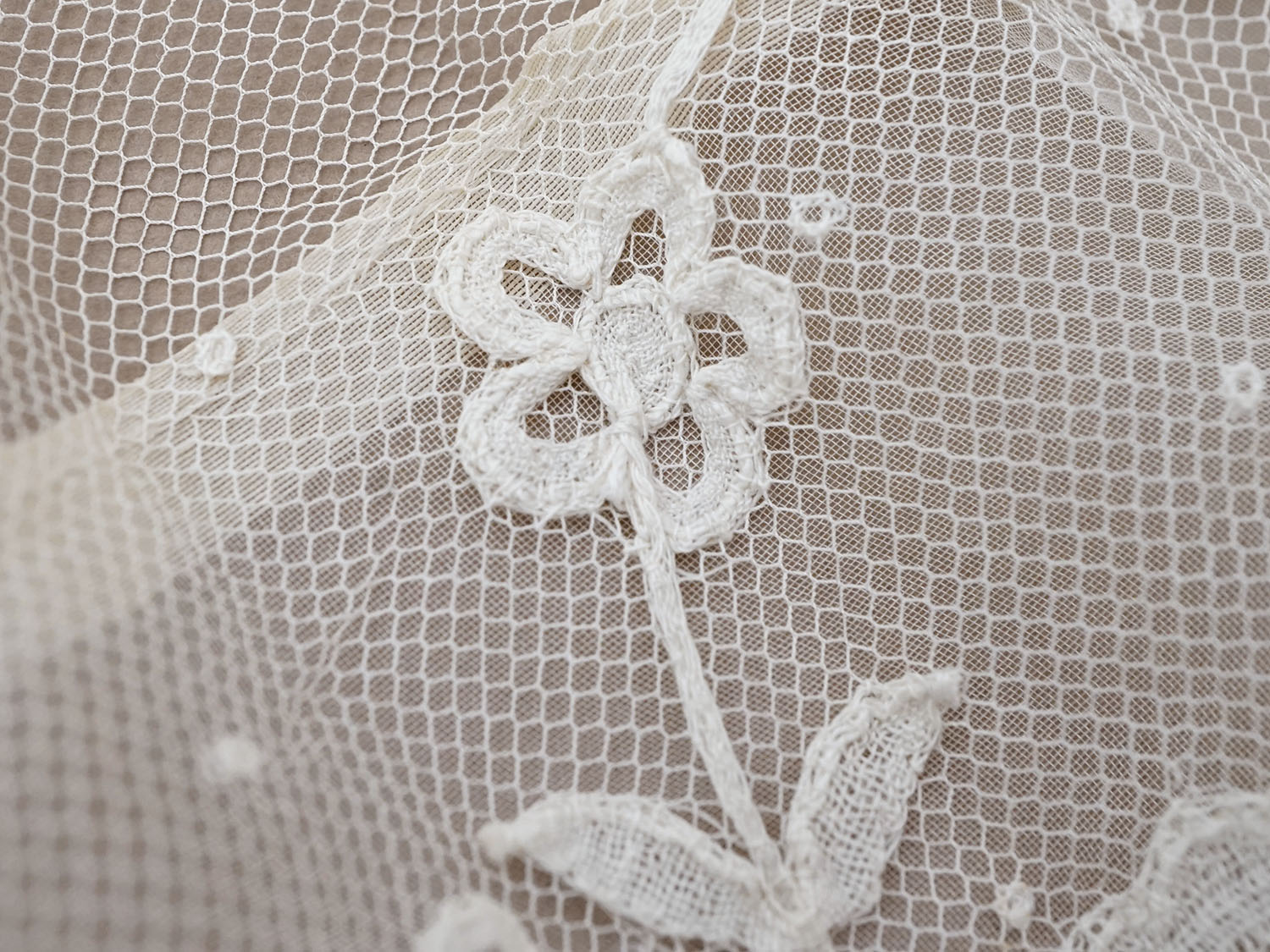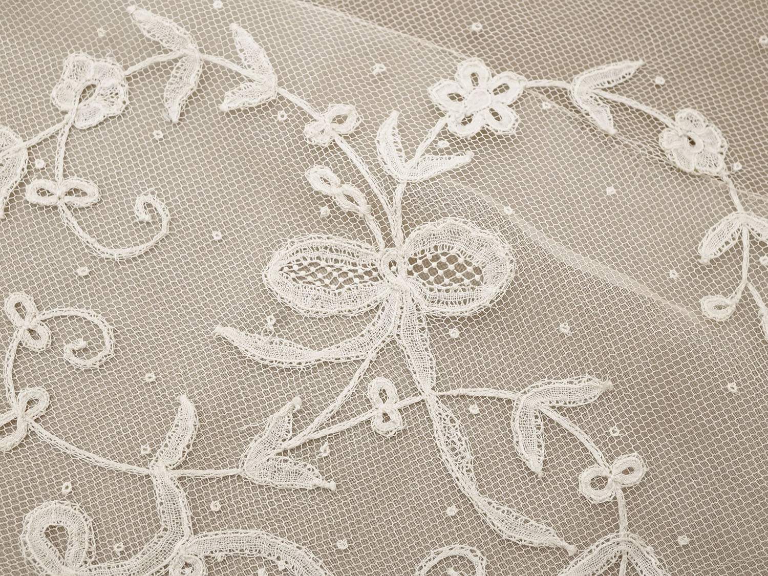 繊細な手編みのボビンレースのモチーフが、ひとつひとつチュールレースに縫い付けられています。