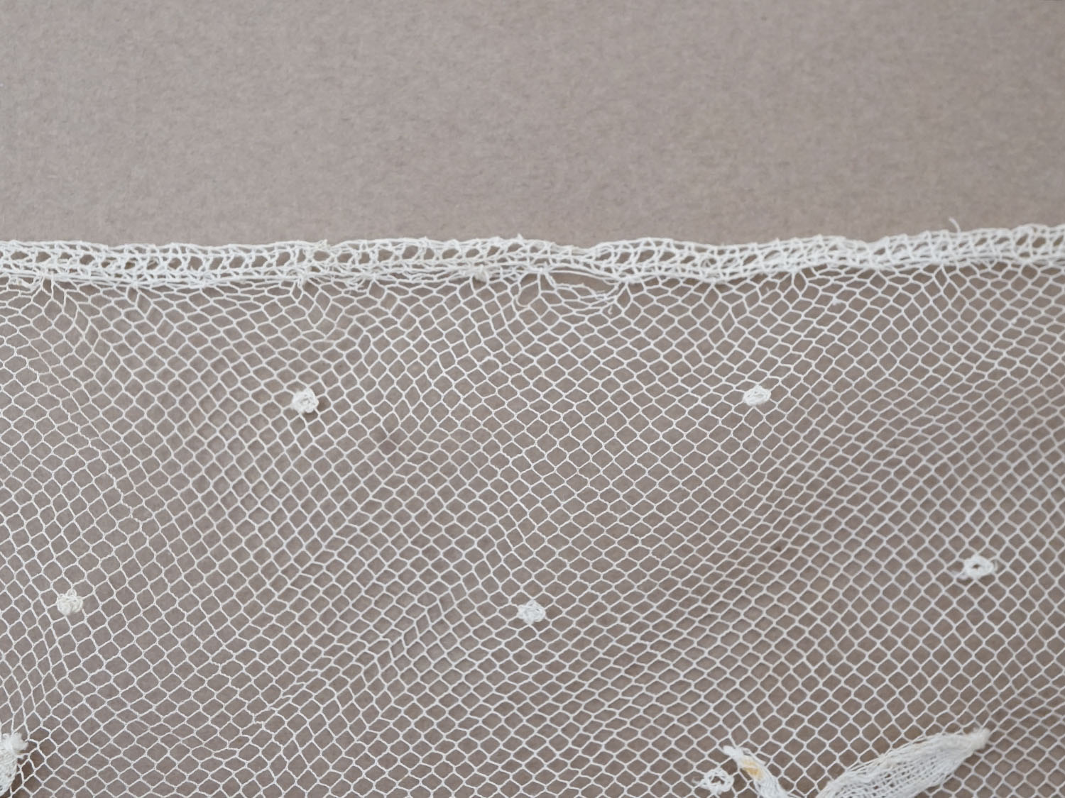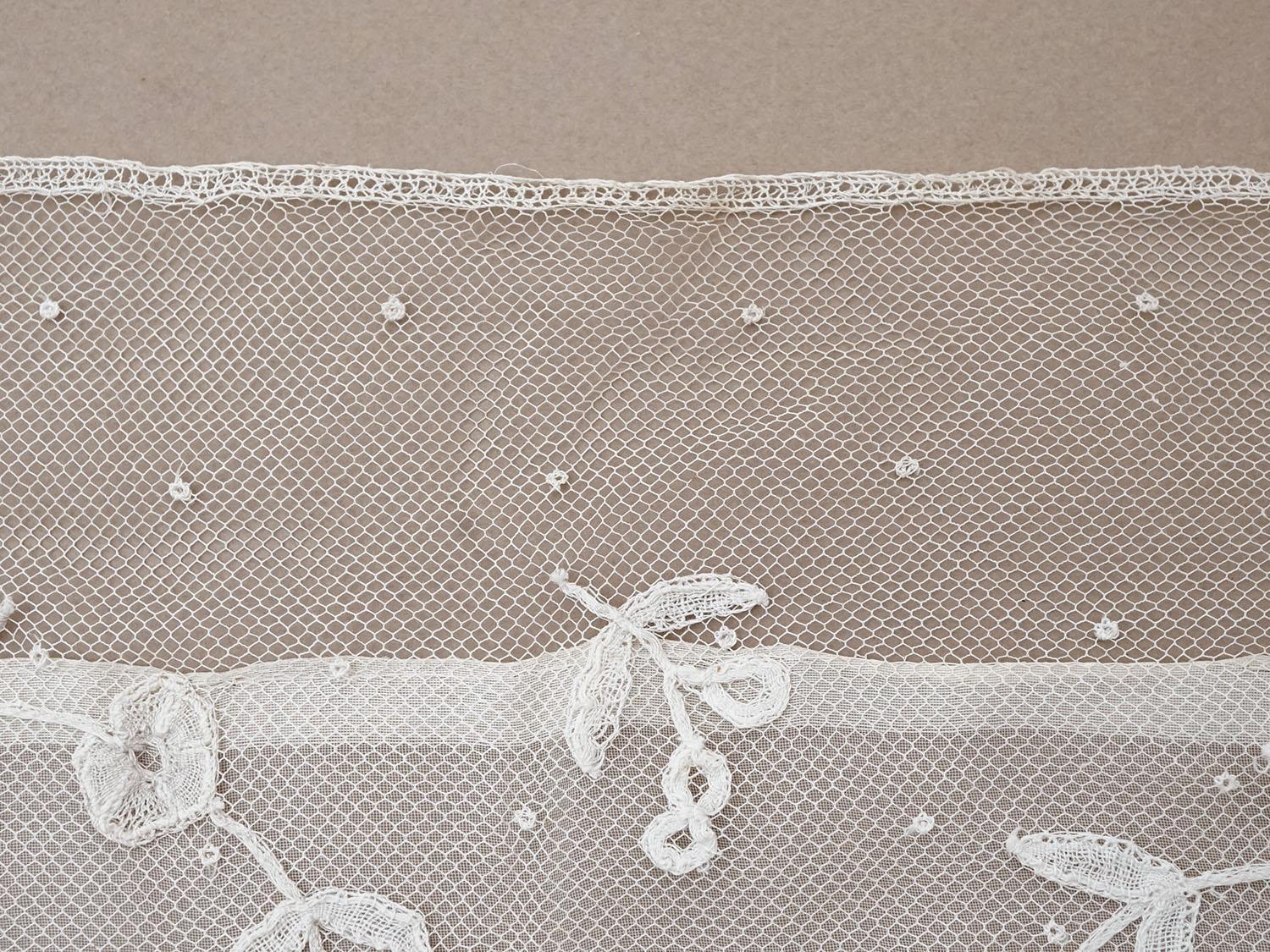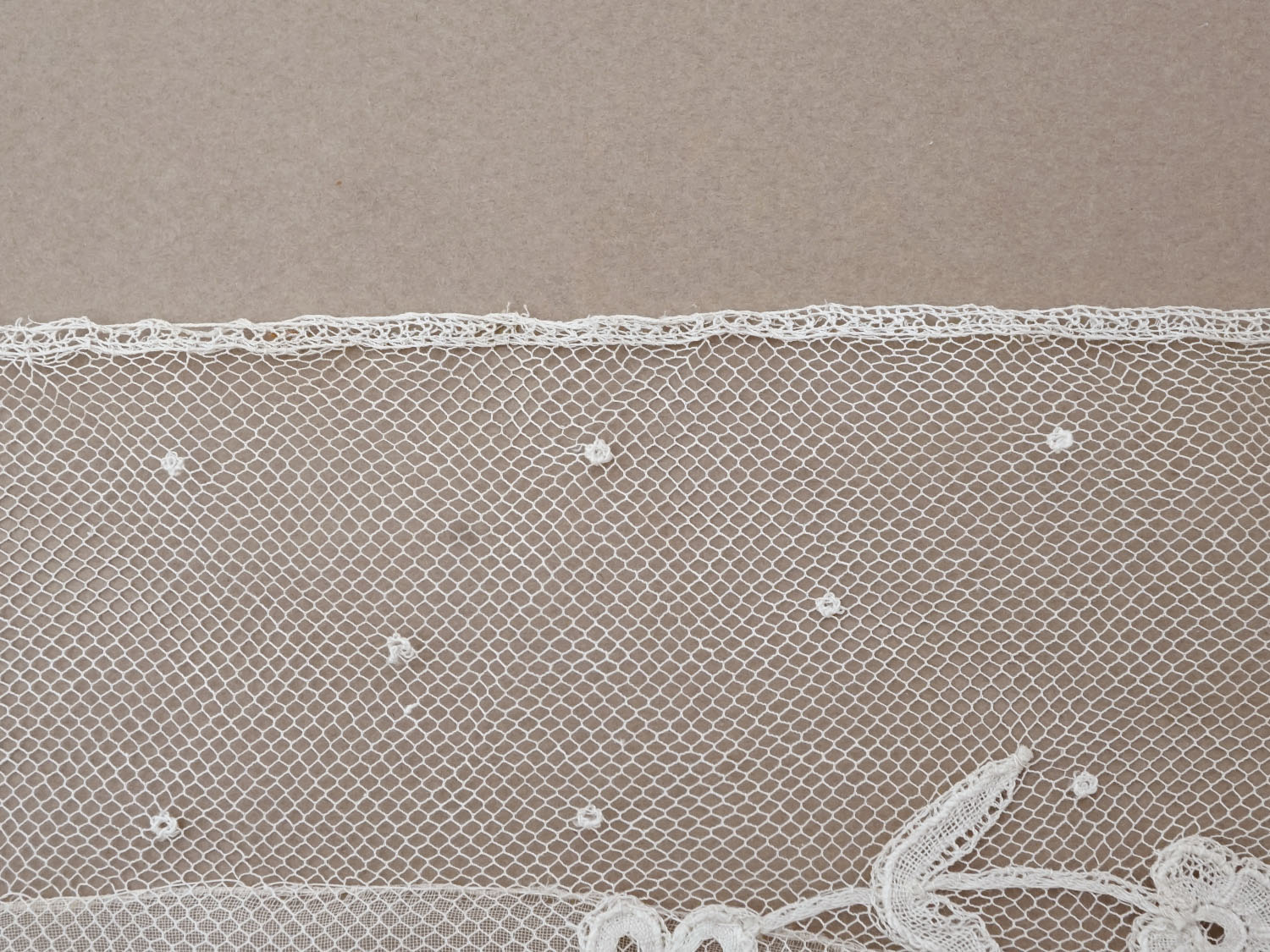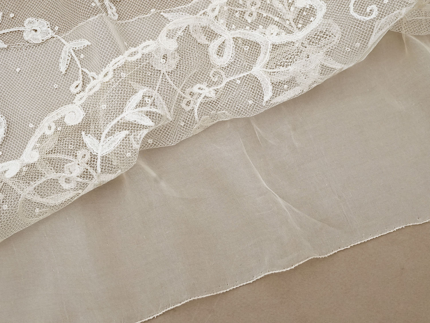 繊細な手編みのボビンレースのモチーフが、ひとつひとつチュールレースに縫い付けられています。