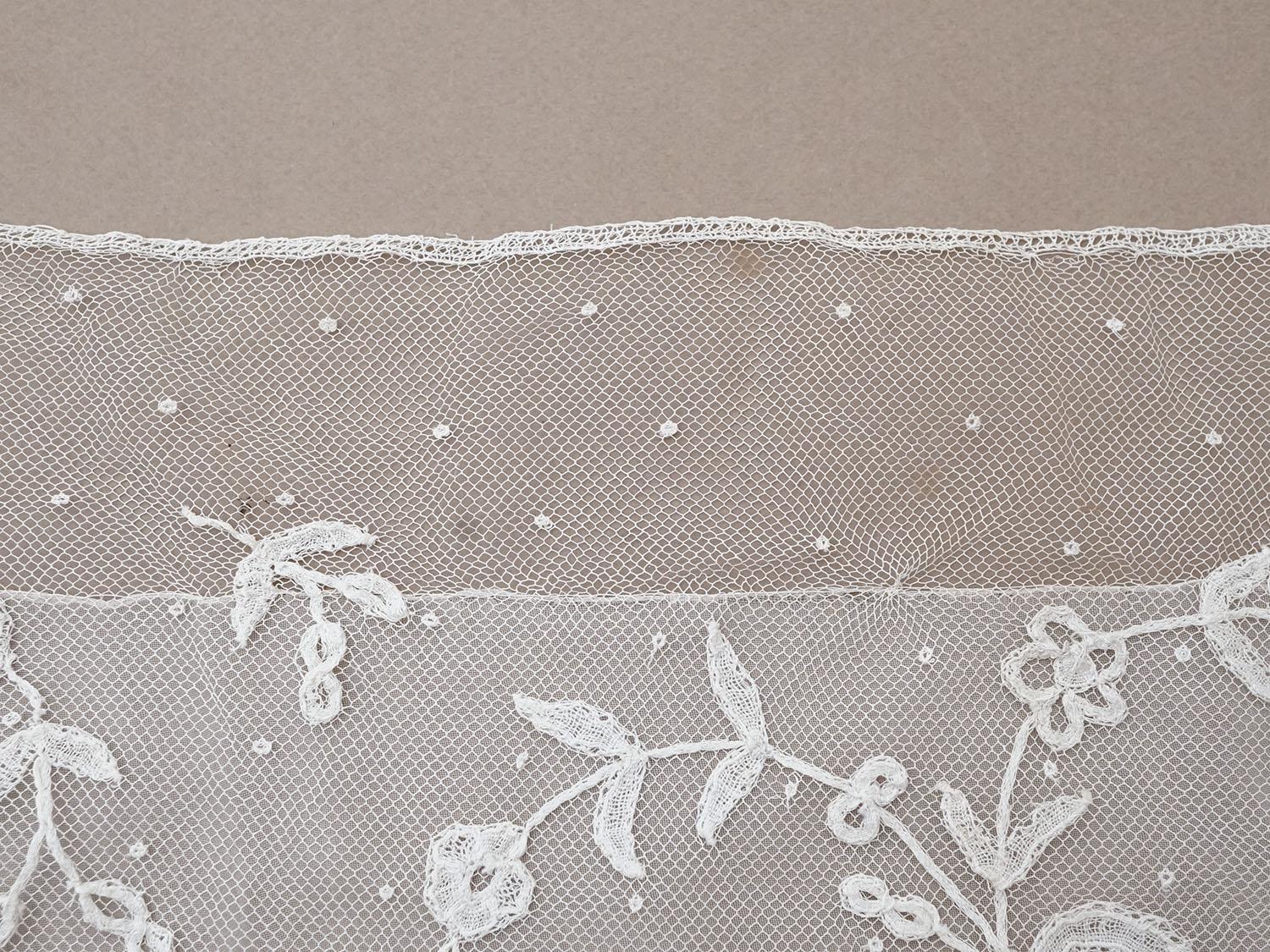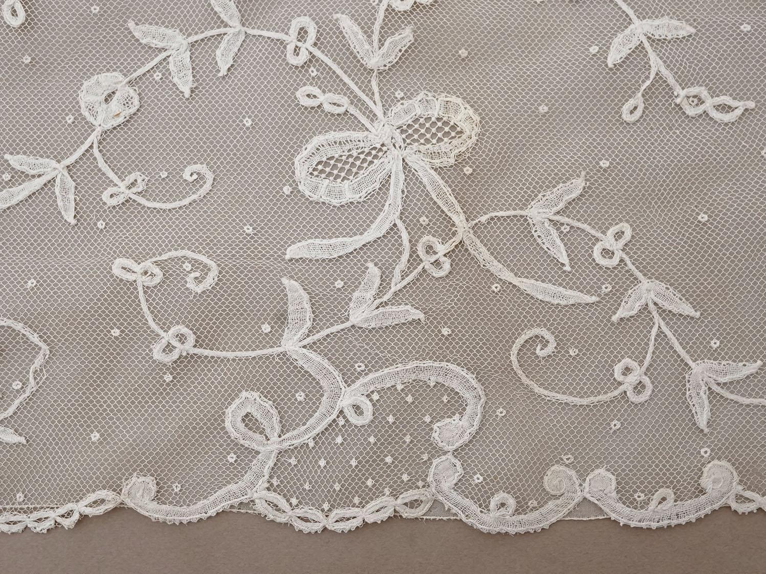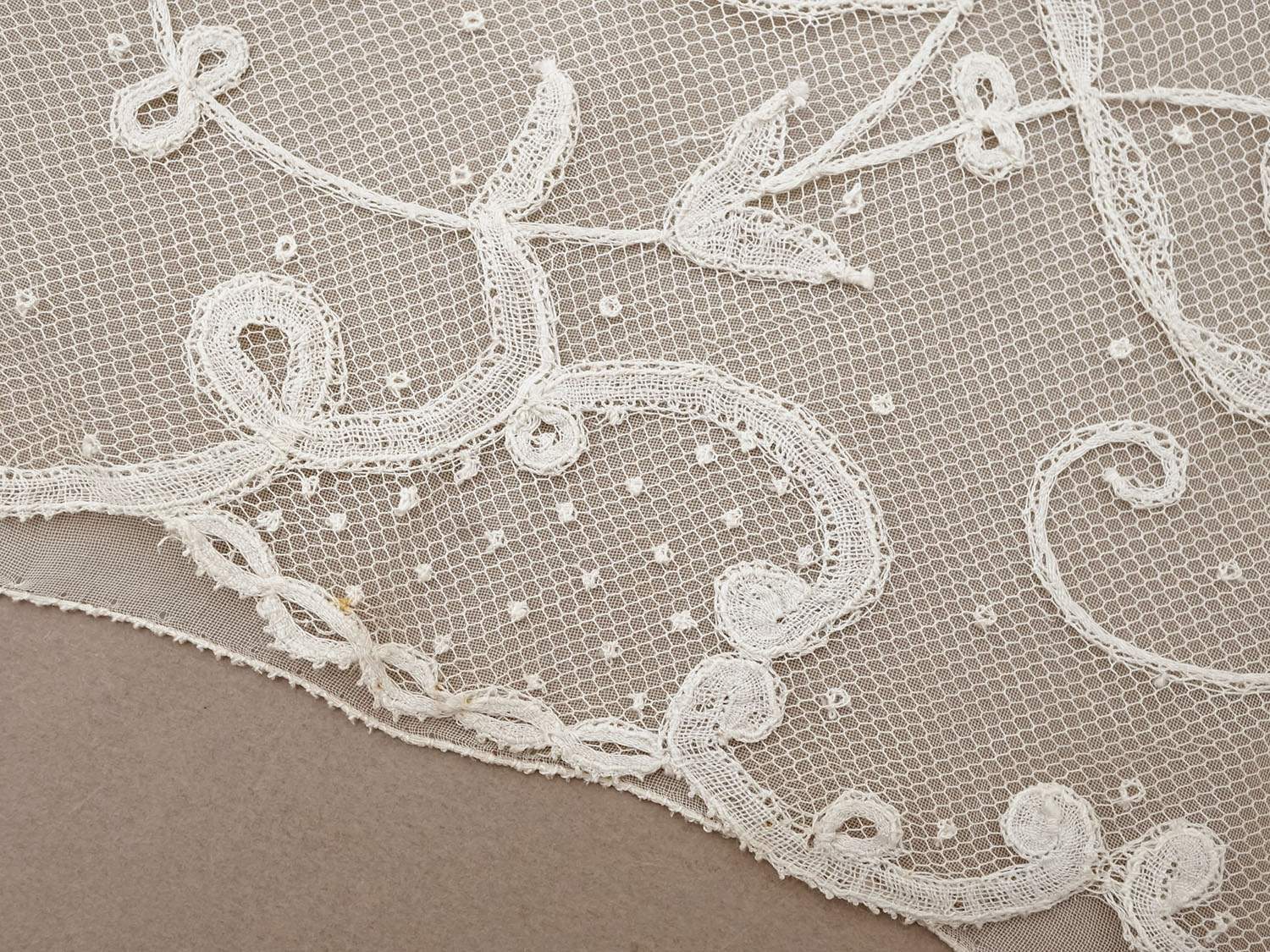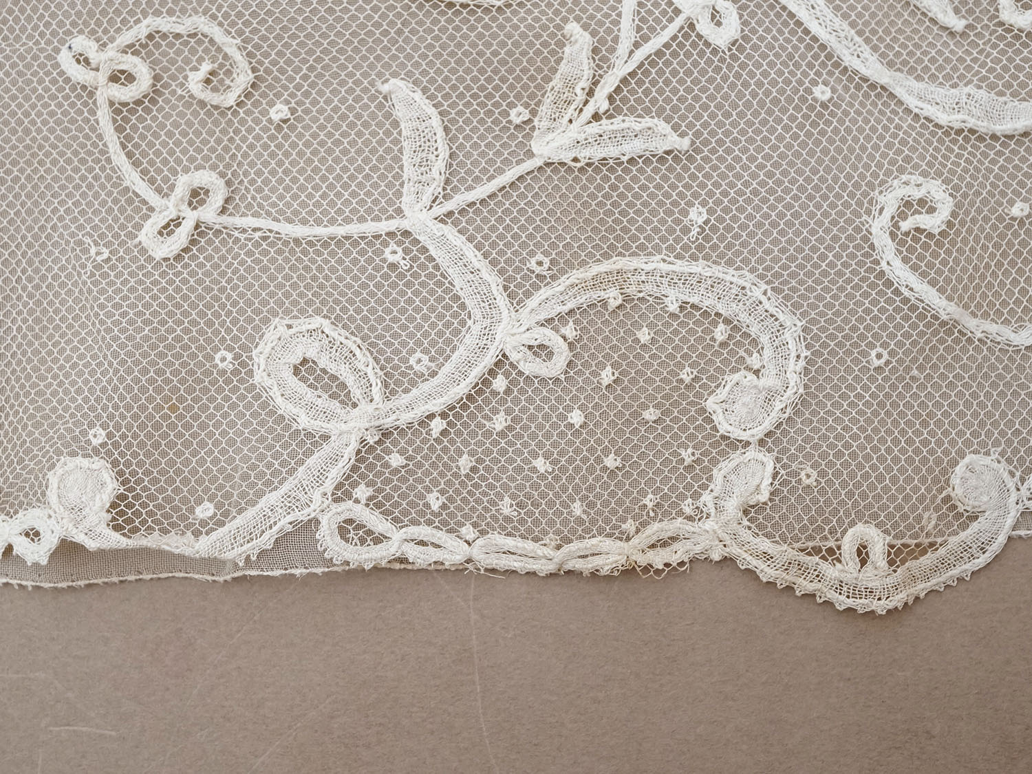 繊細な手編みのボビンレースのモチーフが、ひとつひとつチュールレースに縫い付けられています。