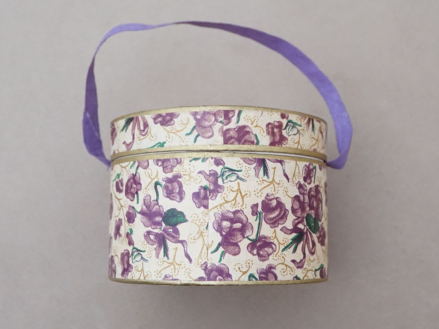 紫色の砂糖菓子が入っていた、帽子箱の形をしたボックスです。