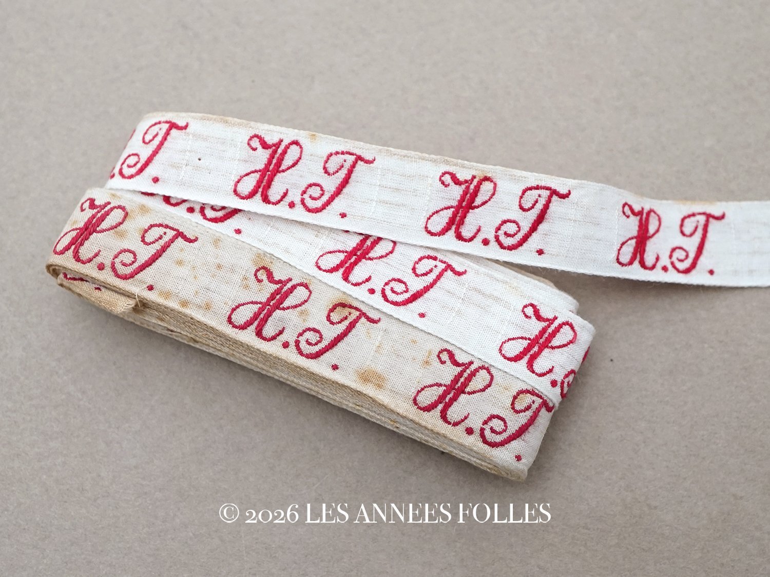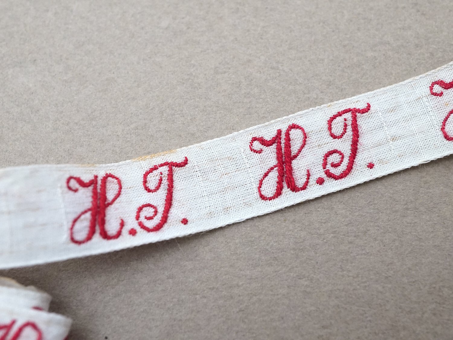 幅広のリボンにボルドー色の大きなイニシャルが美しいテープです。
