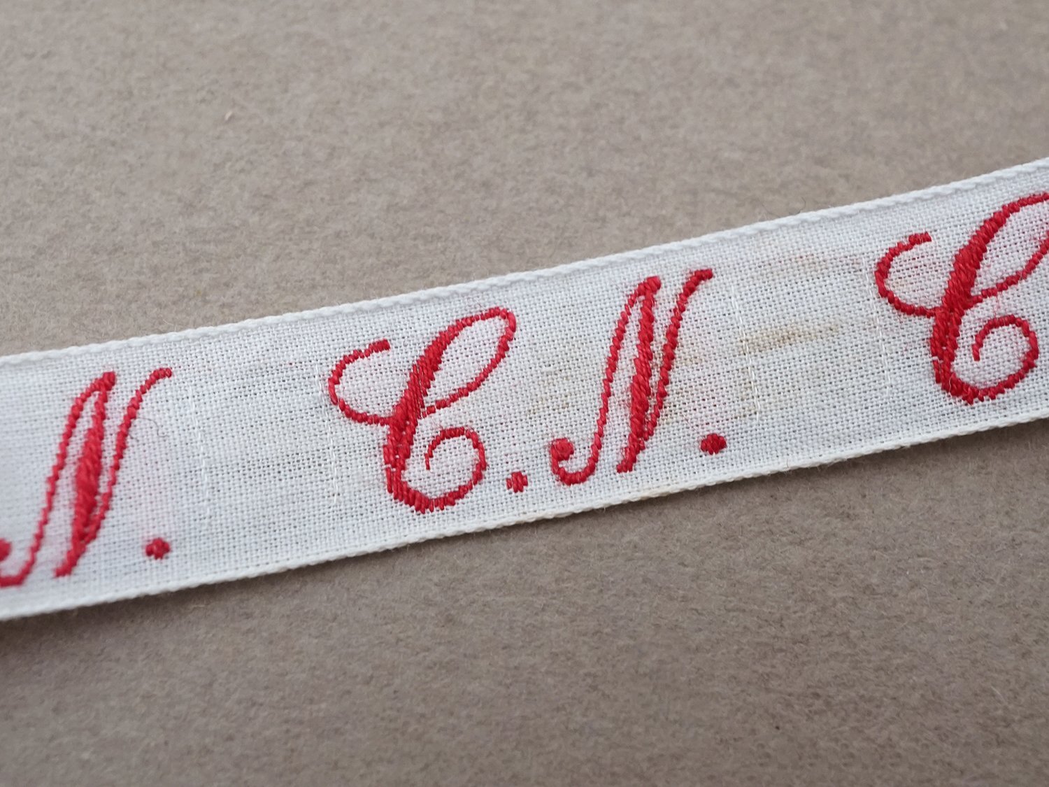 幅広のリボンにボルドー色の大きなイニシャルが美しいテープです。