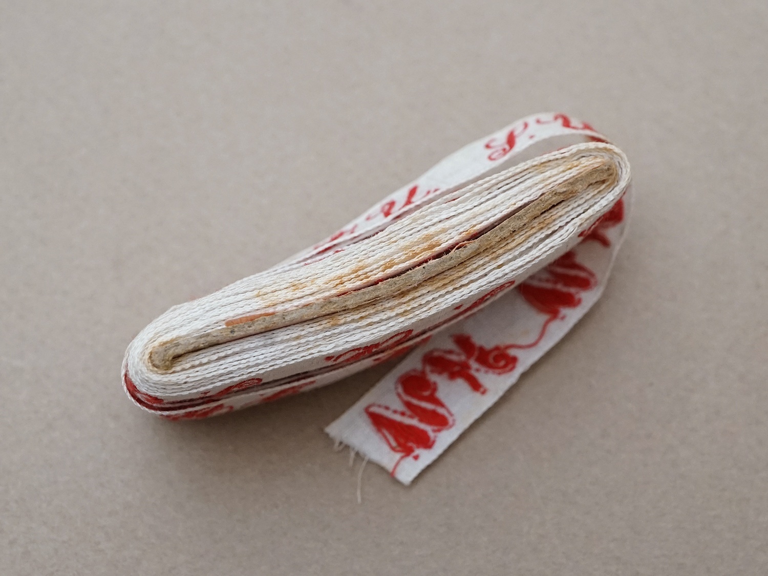 幅広のリボンにボルドー色の大きなイニシャルが美しいテープです。