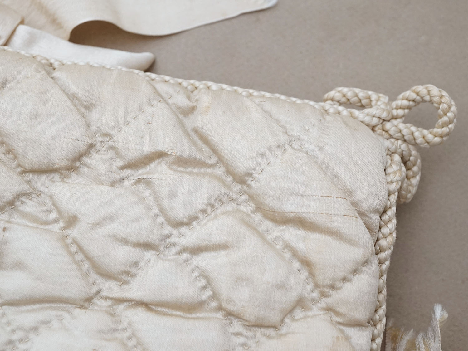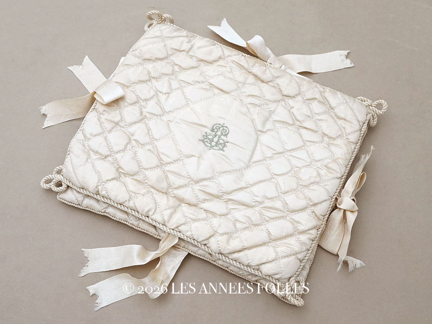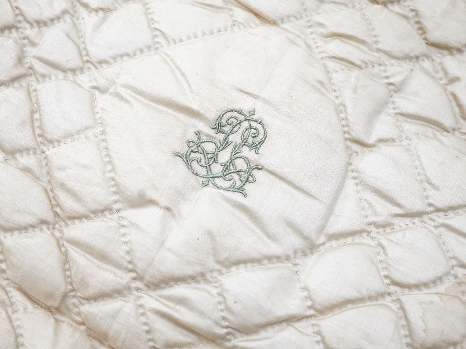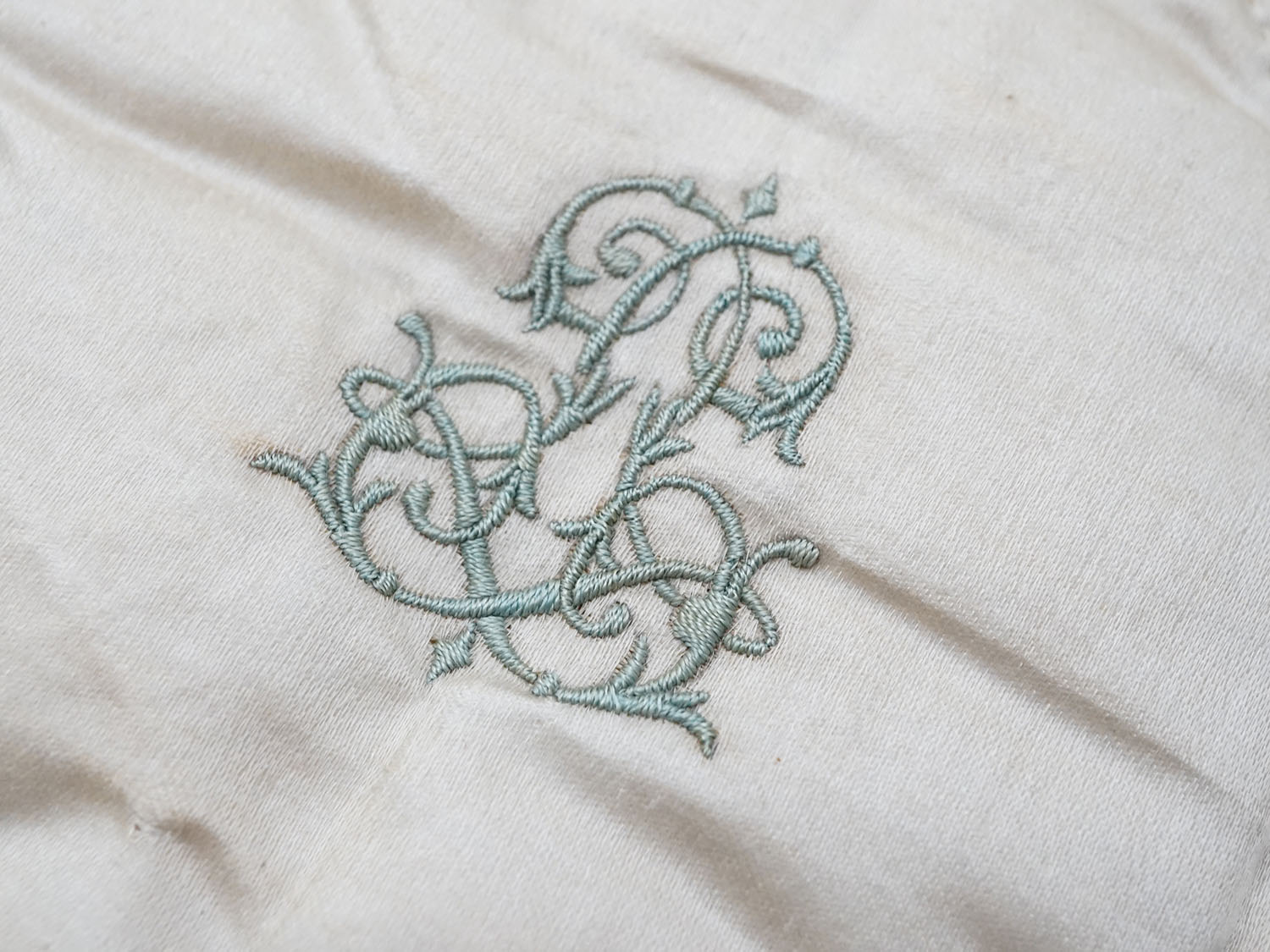 アンティーク シルク製 ハンキーケース 水色のモノグラム刺繍入り エクリュ ハンカチ用ポシェット