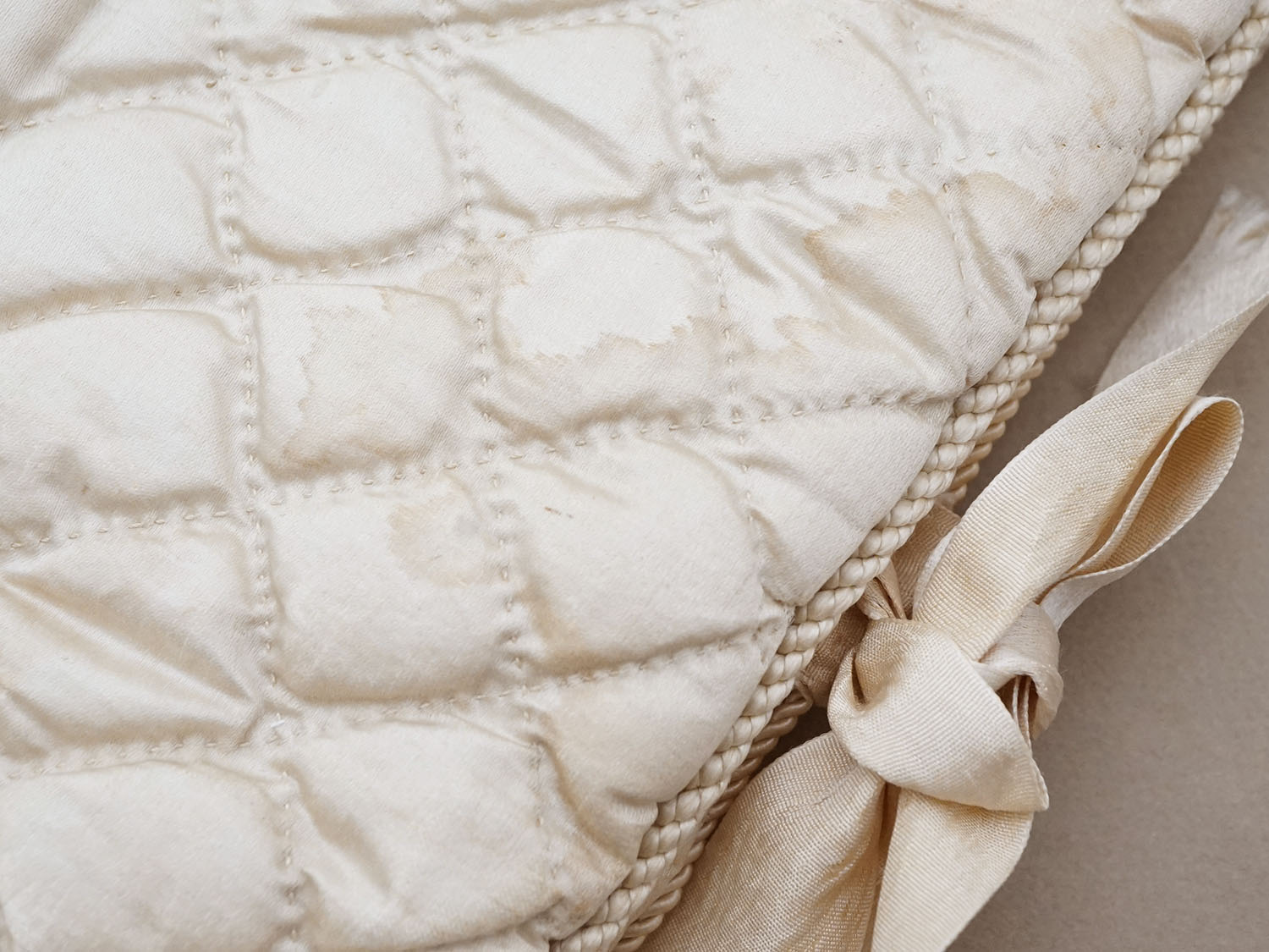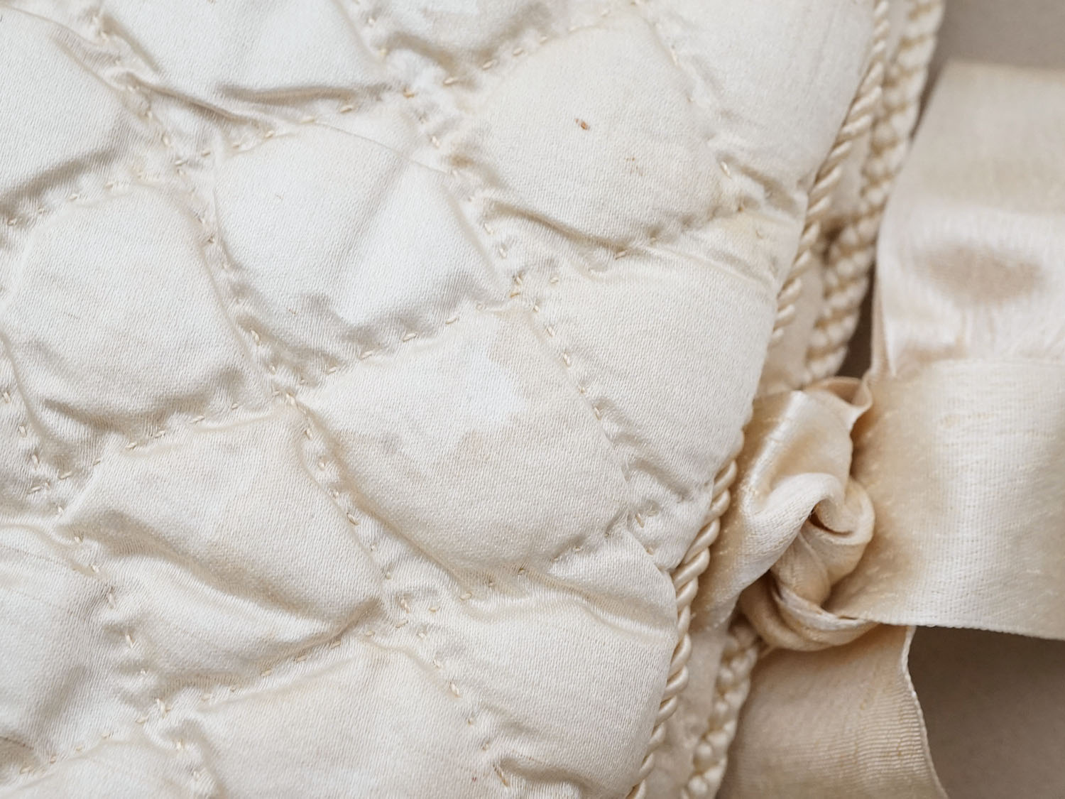 3箇所ほどのごく淡いシミと、数箇所のシルク地の傷みが見られます。