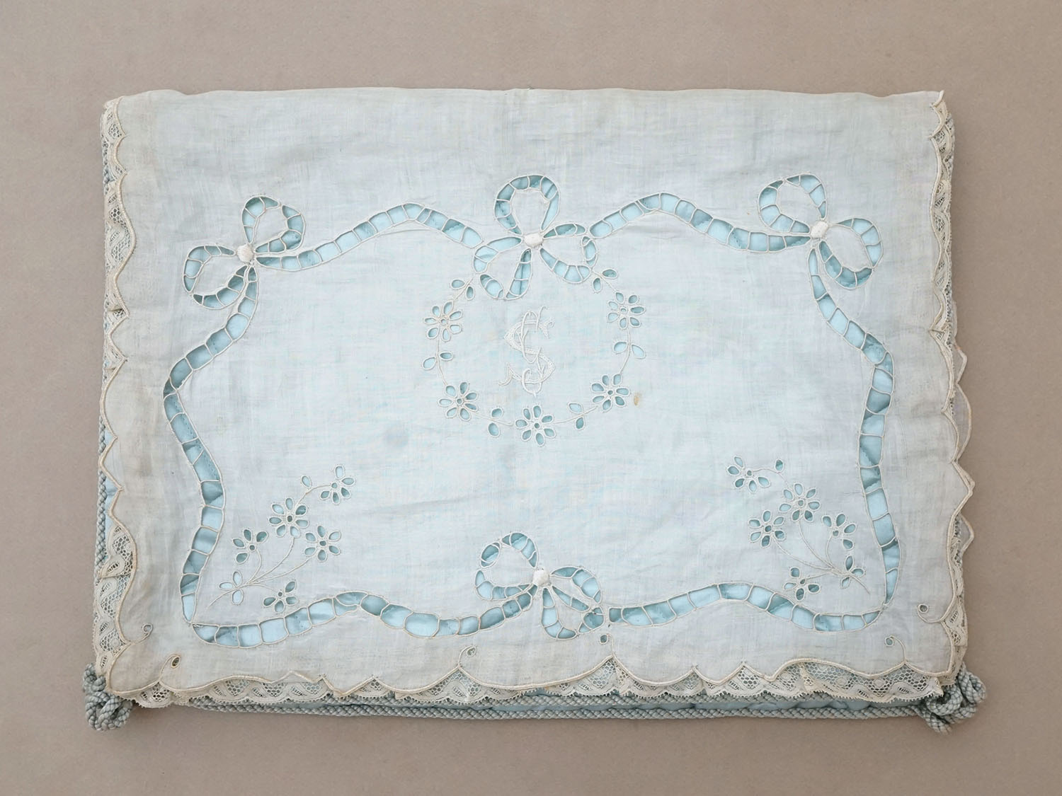 アンティーク イニシャル刺繍入り シルク製 ハンキーケース パウダーブルー