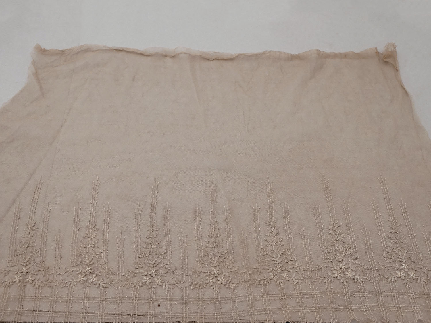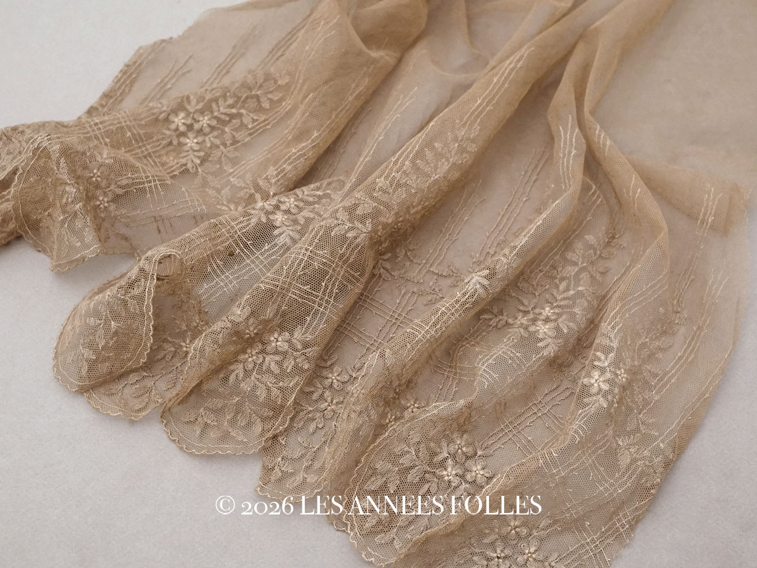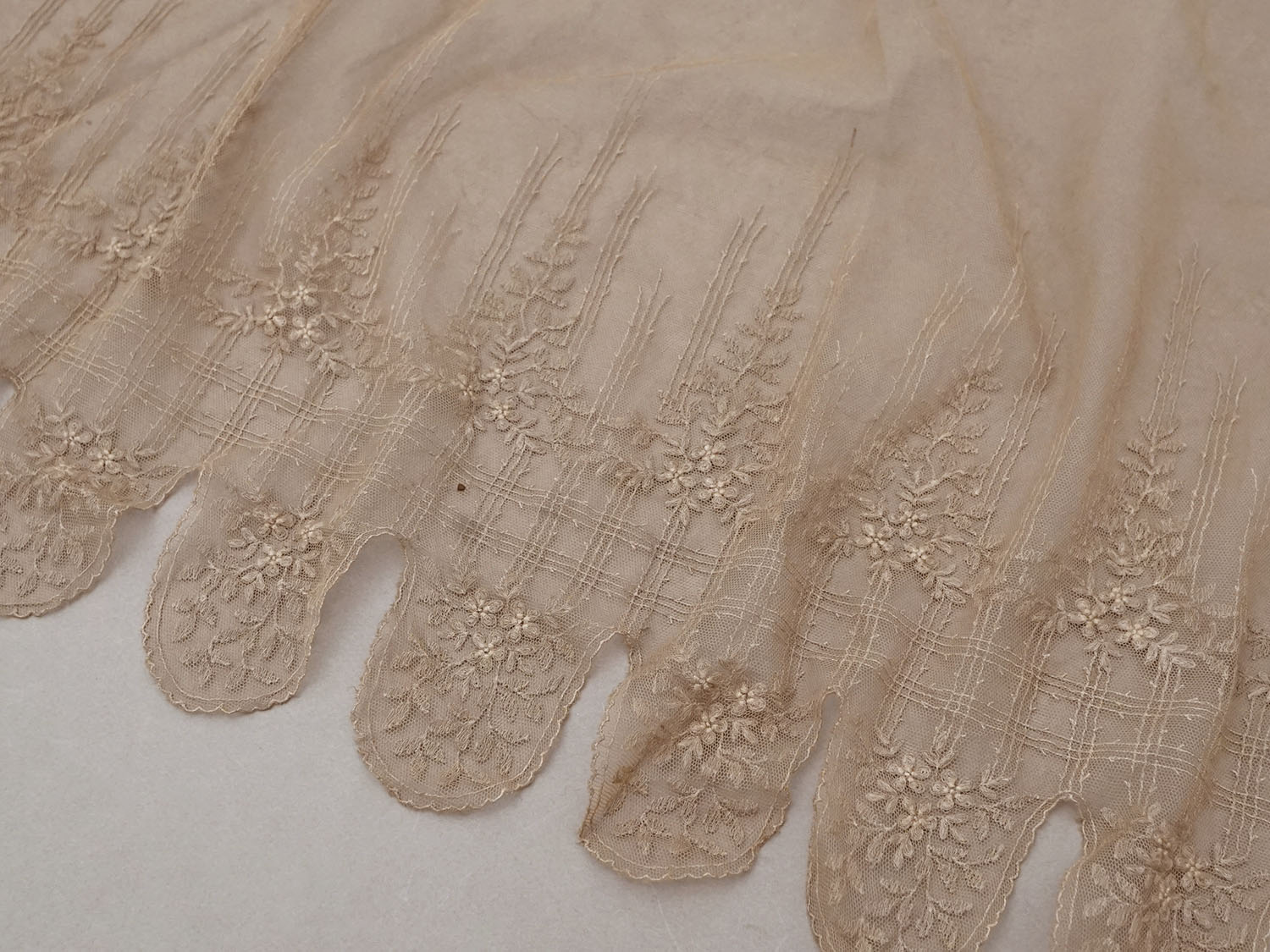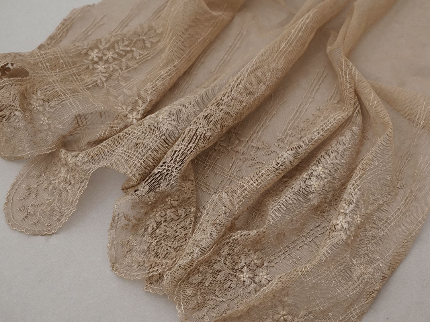 *蚤の市*アンティーク 花模様の刺繍入り チュールレース 胡桃色
