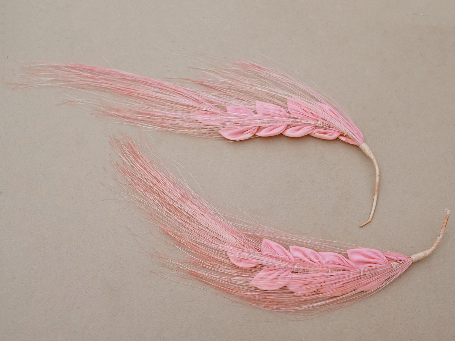 羽の形をしたピンク色の帽子の装飾2点のセットです。