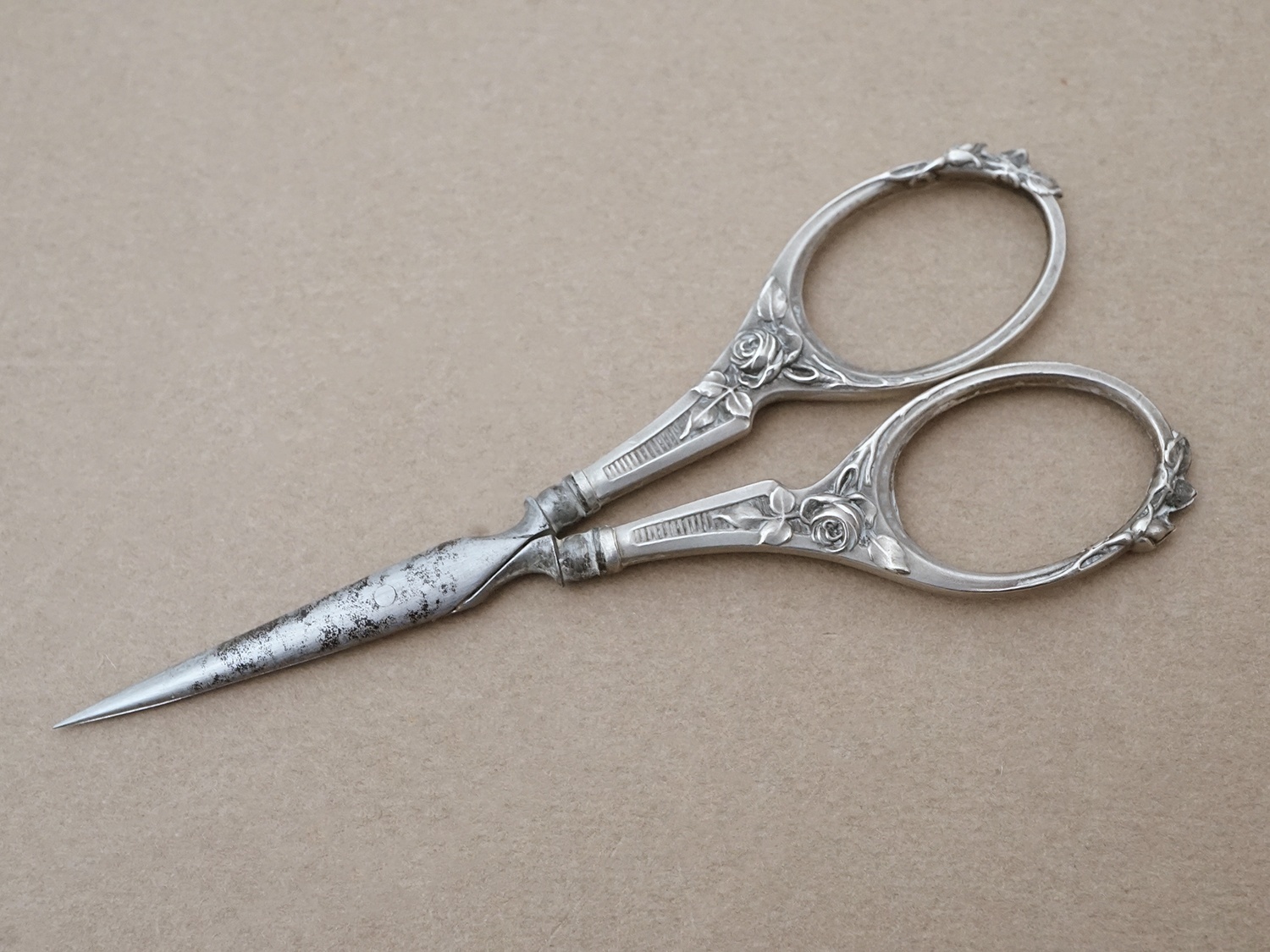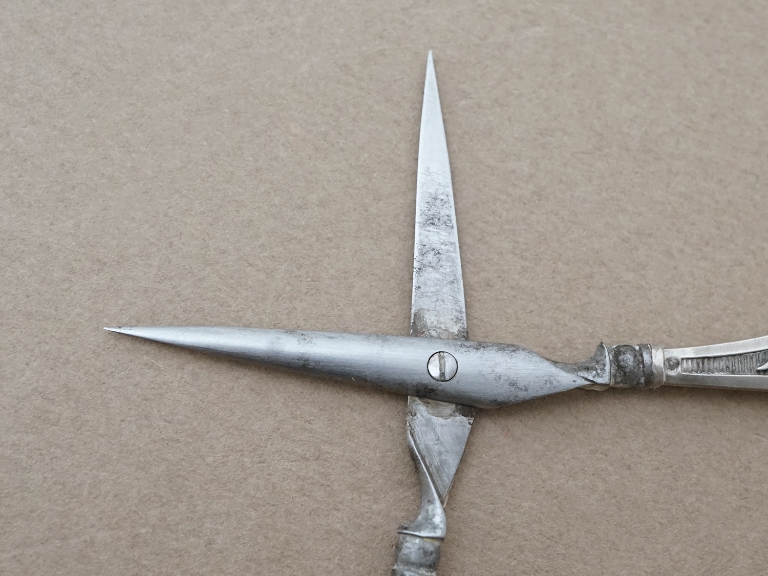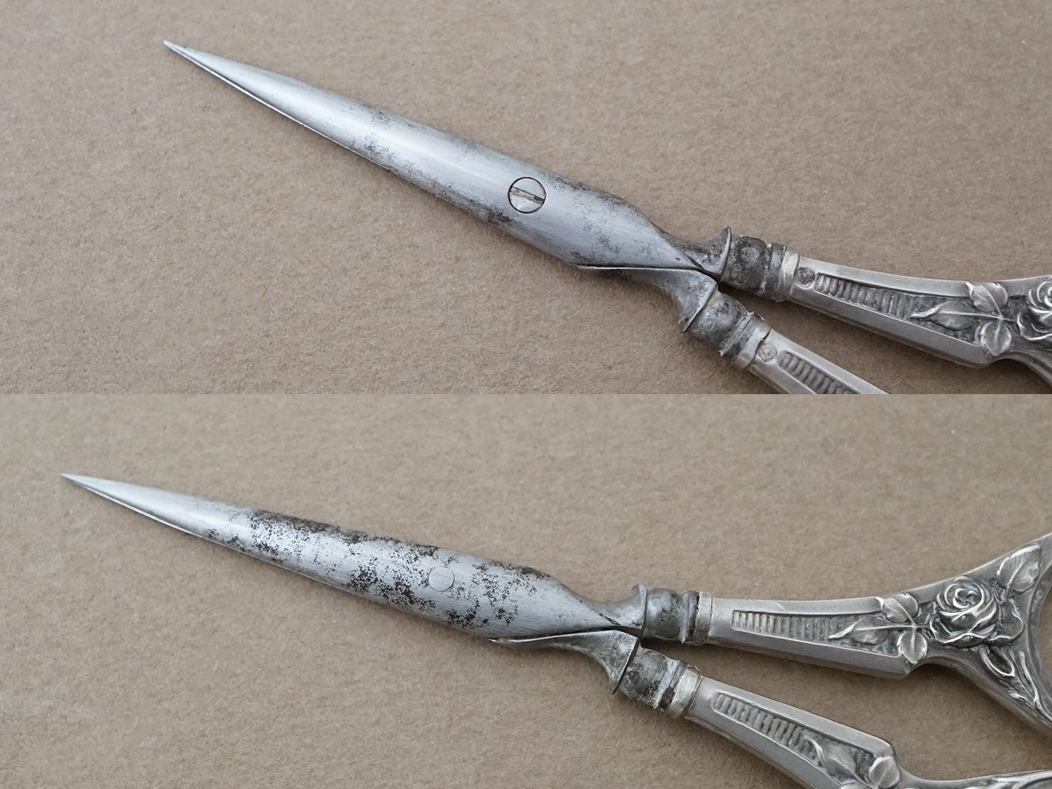 ハサミの刃と目打ちの一部に、経年による黒色の酸化膜(パティナ)が見られます。