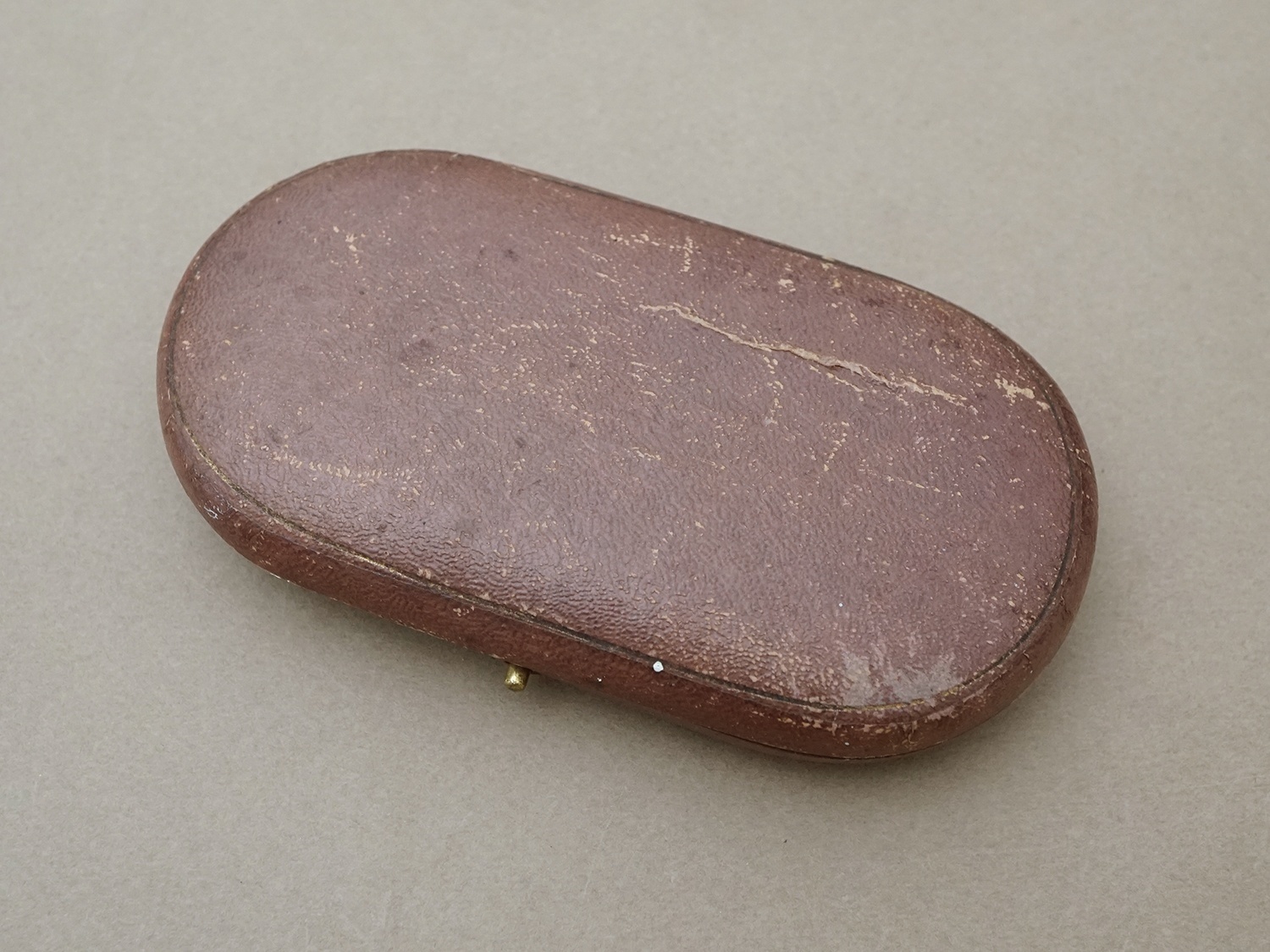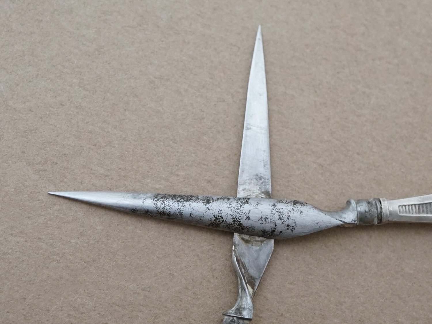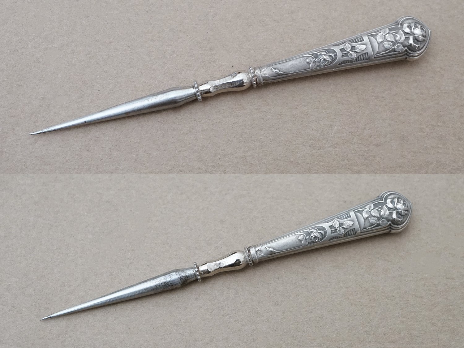 ハサミの刃と目打ちの一部に、経年による黒色の酸化膜(パティナ)が見られます。