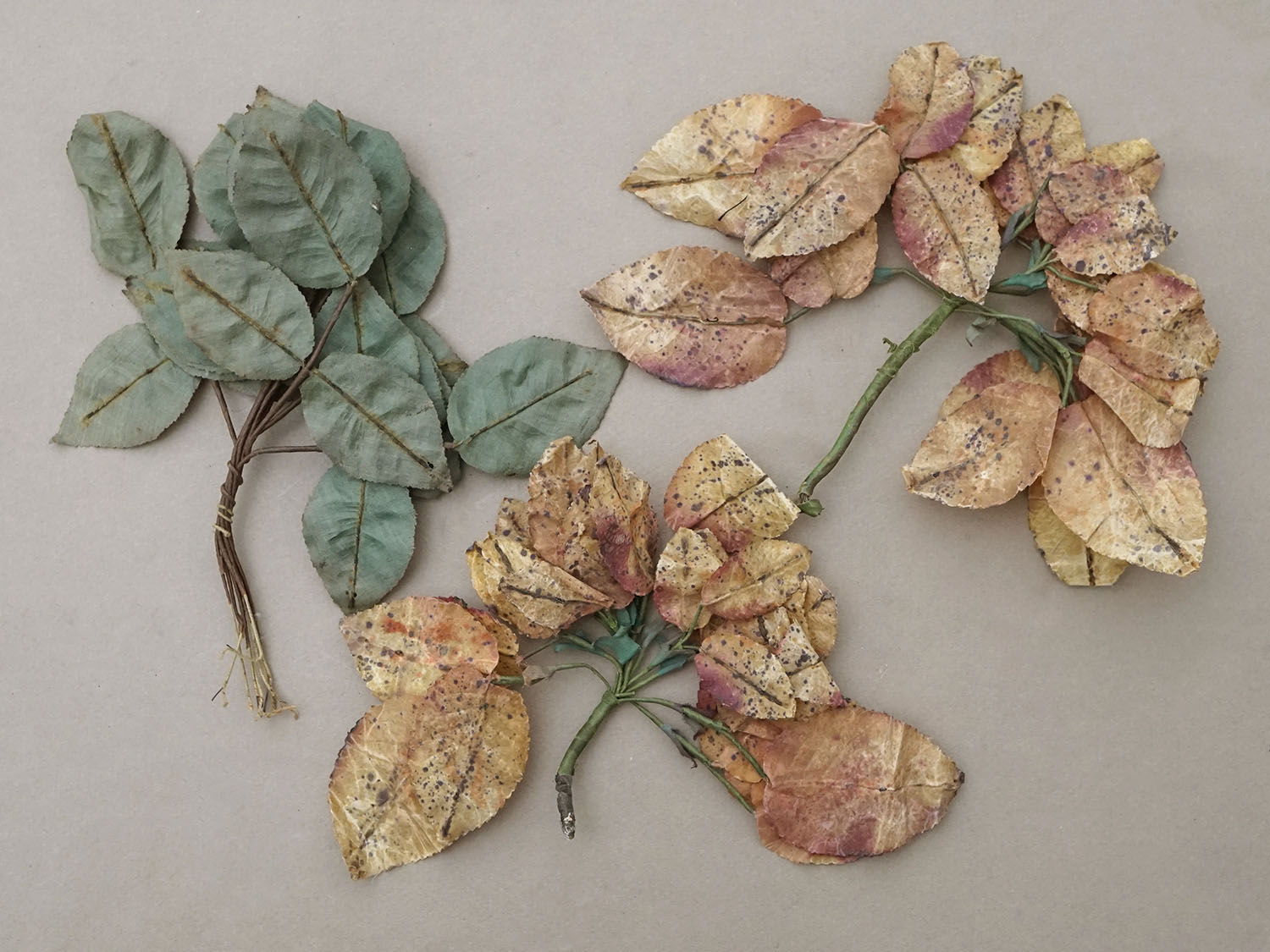 モスグリーンのリーフは布製、秋色のリーフは紙製で、