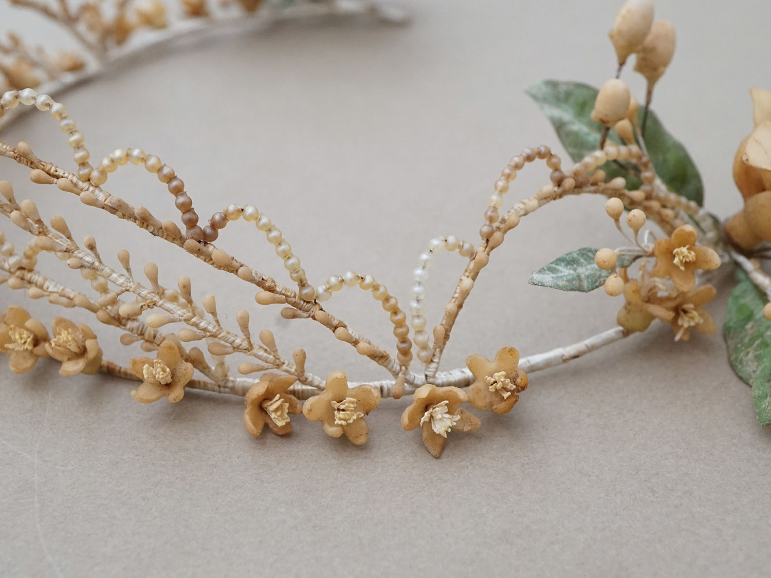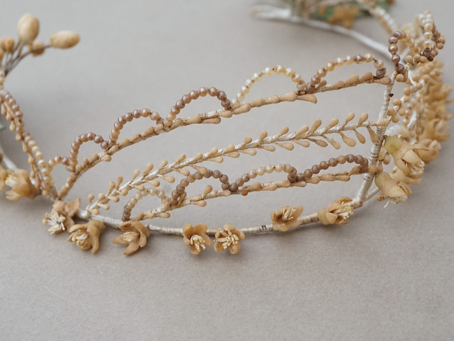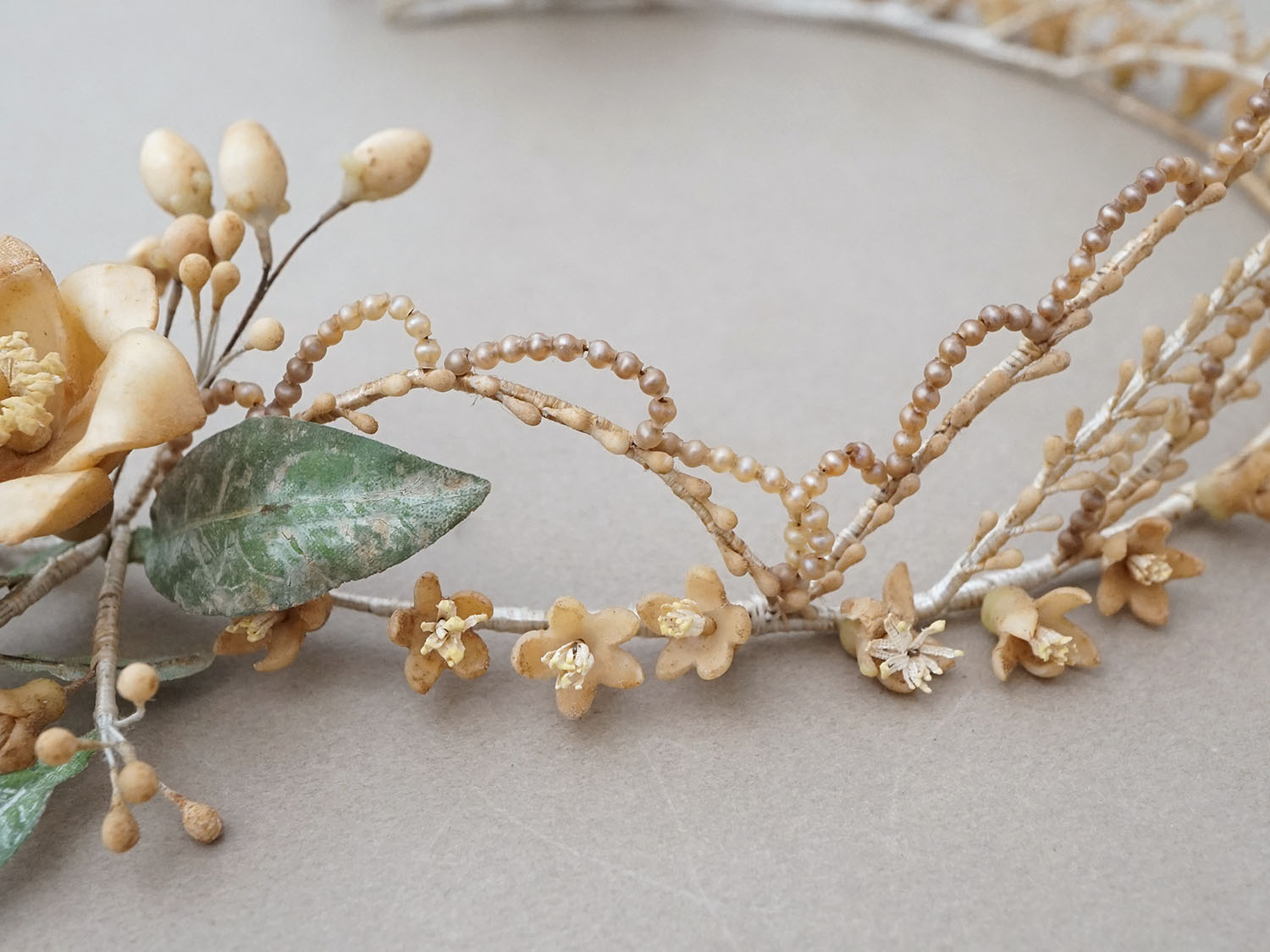 朽ちたような秋色のとても雰囲気のあるワックスフラワーのティアラです。