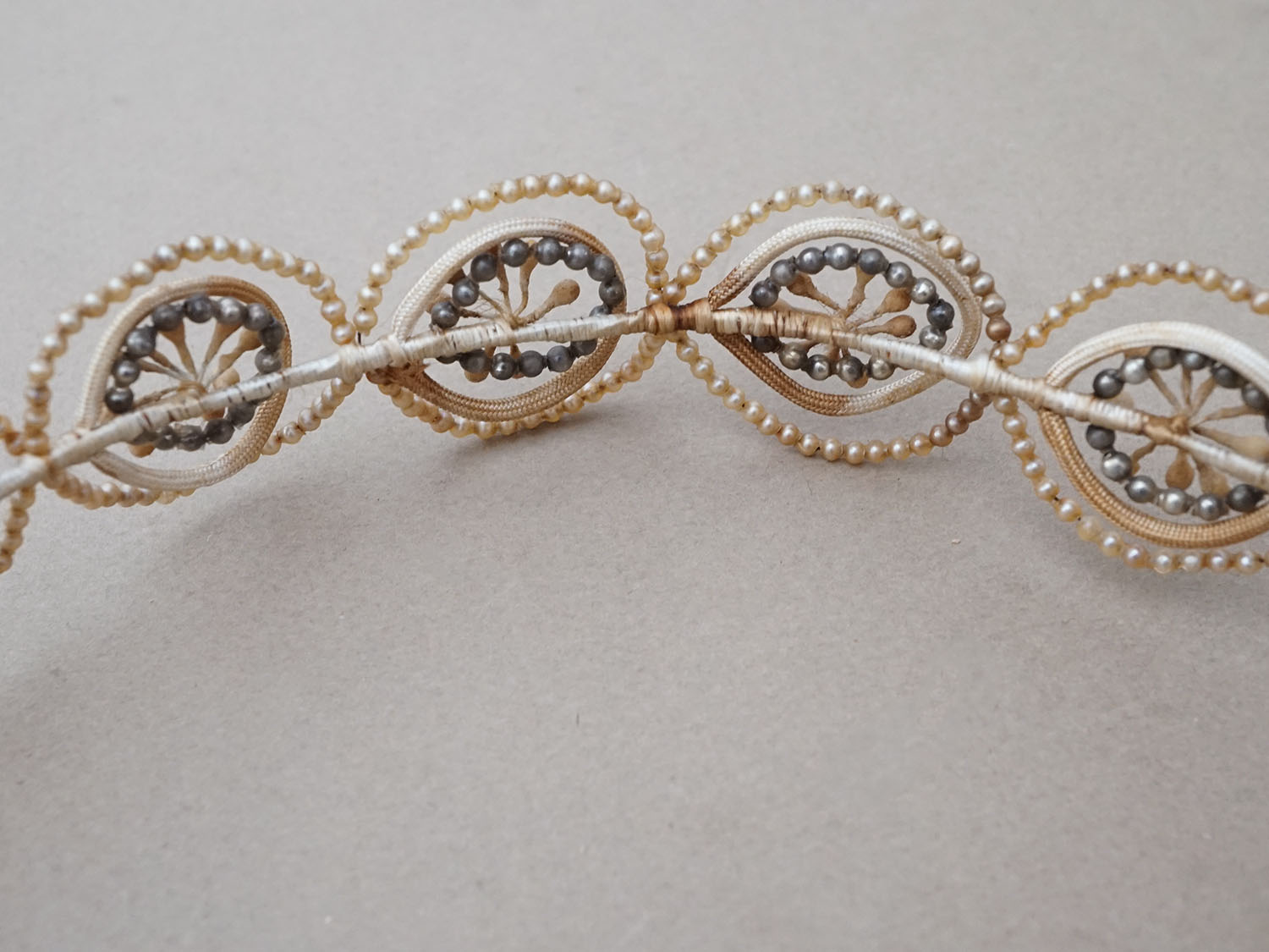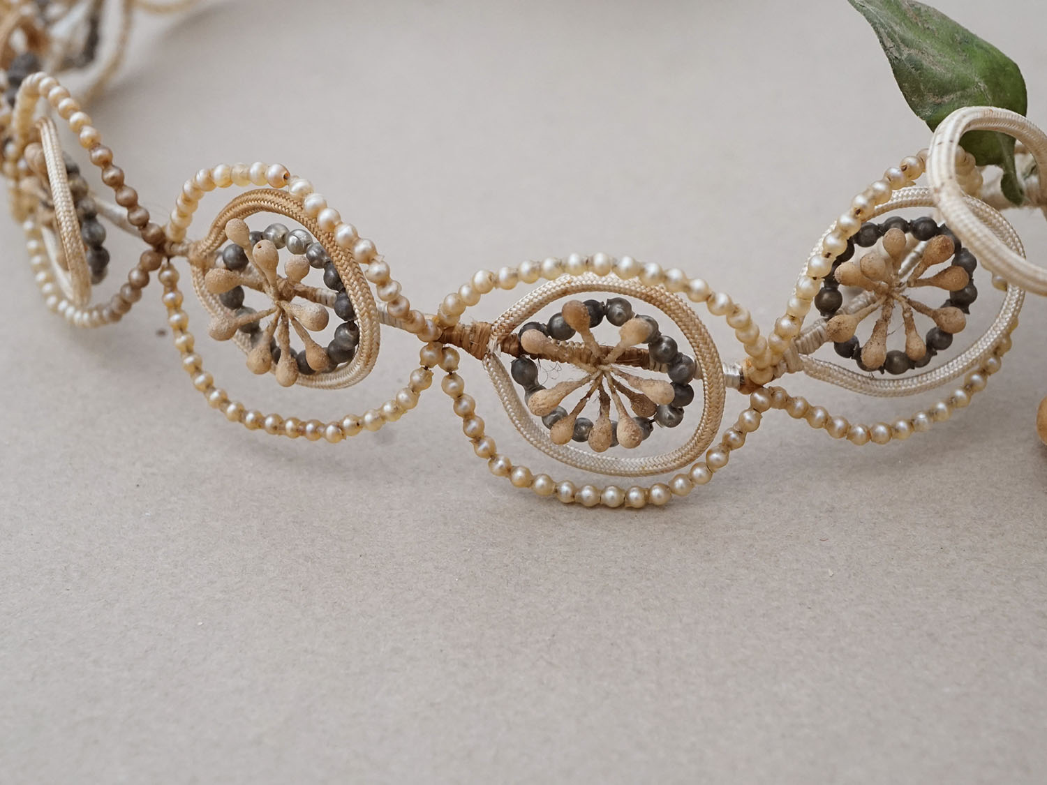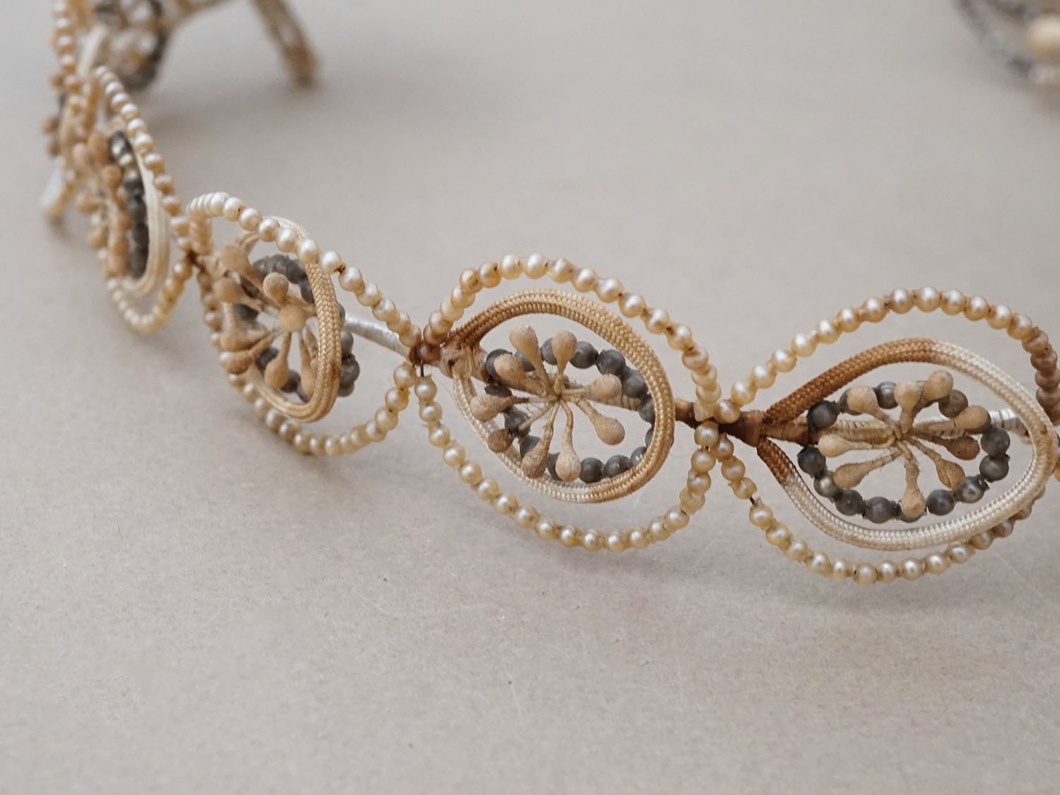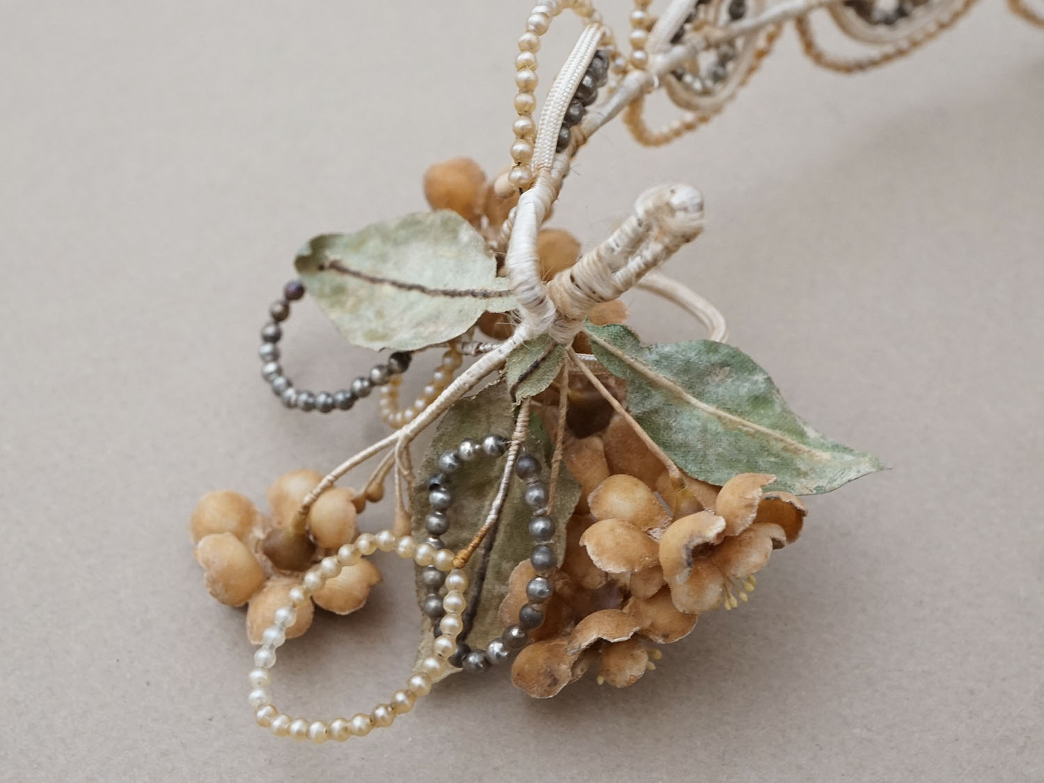 小さなスフレパールで彩られたワックスフラワーのティアラとブローチのセットです。
