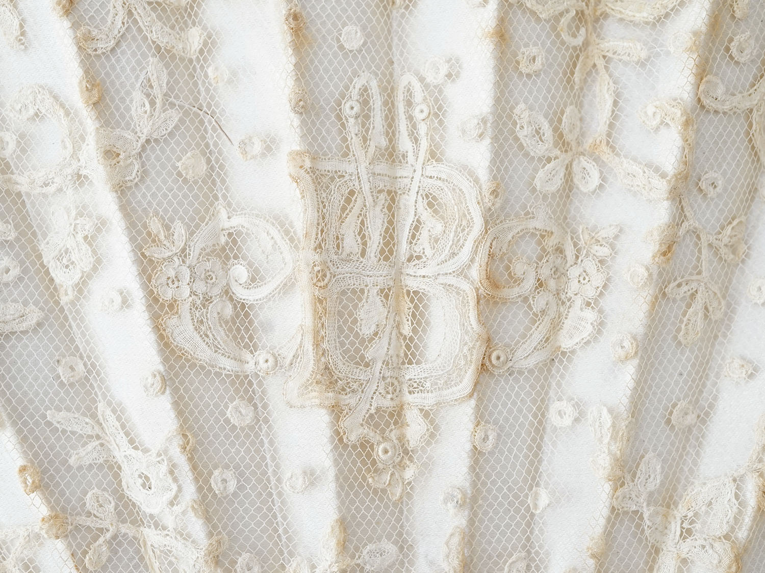 レースの縁には茶色っぽいシミが見られます。