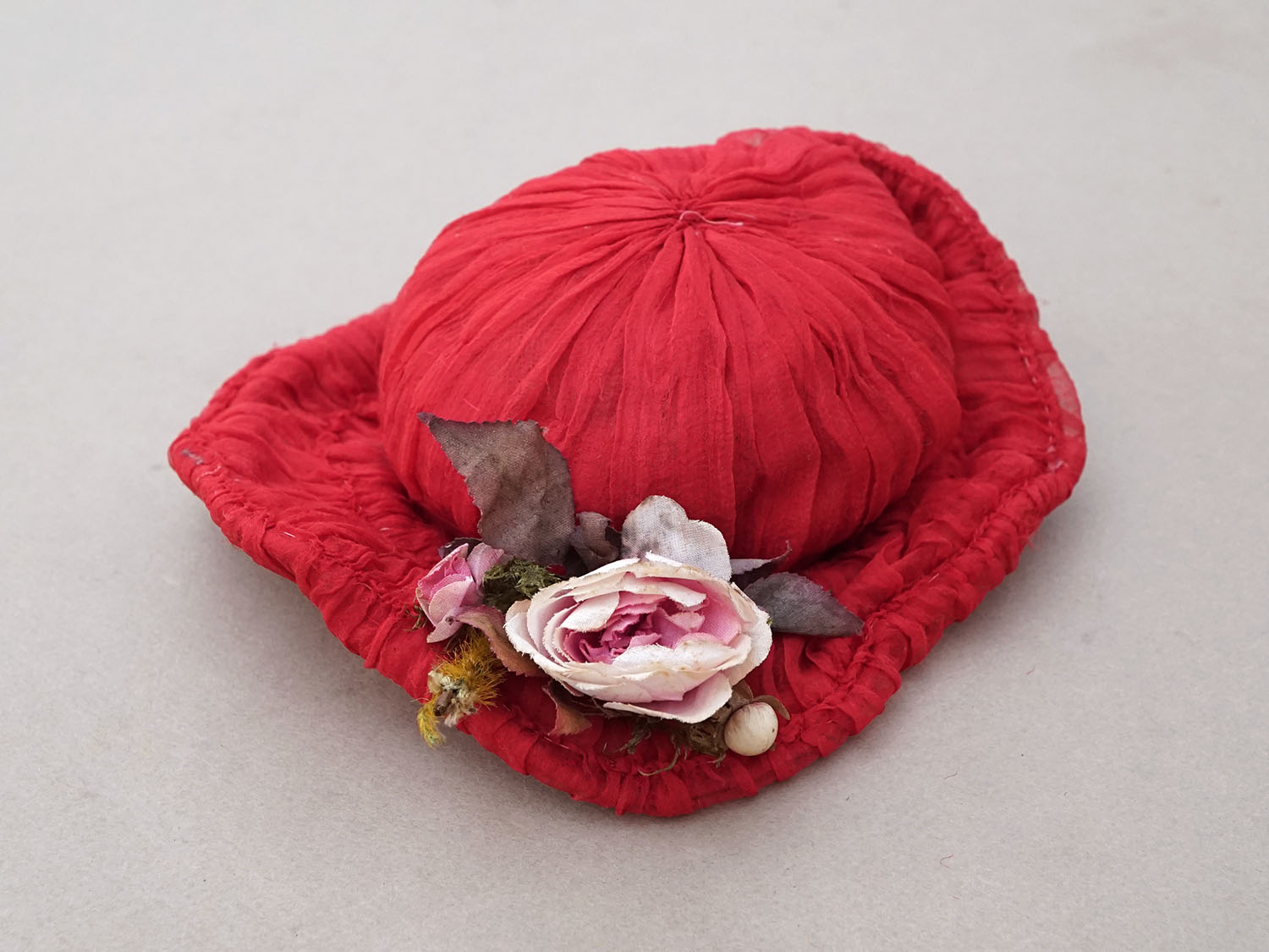落ち着いた赤のシルクシフォンで作られたドールハットです。